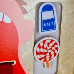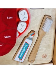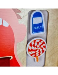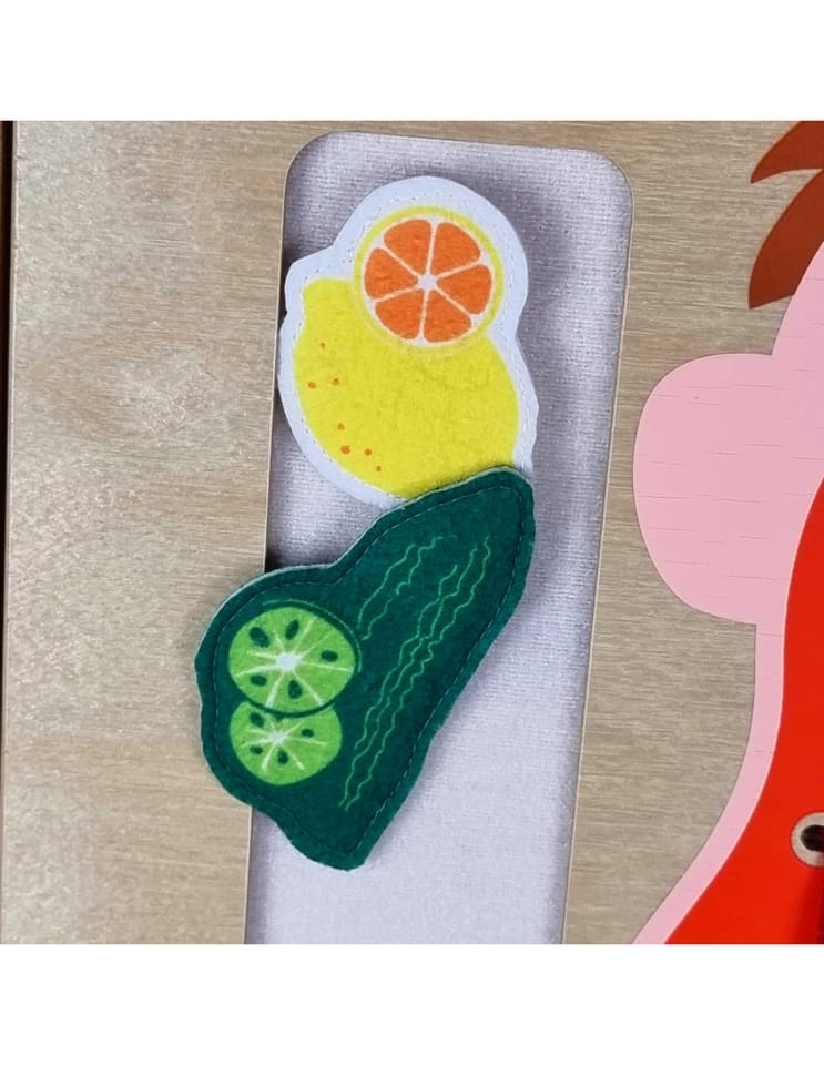 - - Zawiera produkty spożywcze, które za pomocą rzepów trzeba dopasować do odpowiedniego smaku na języku.