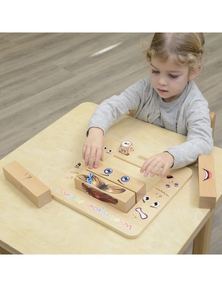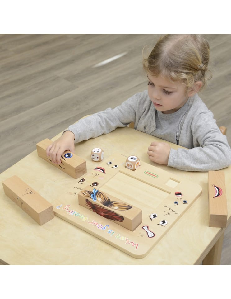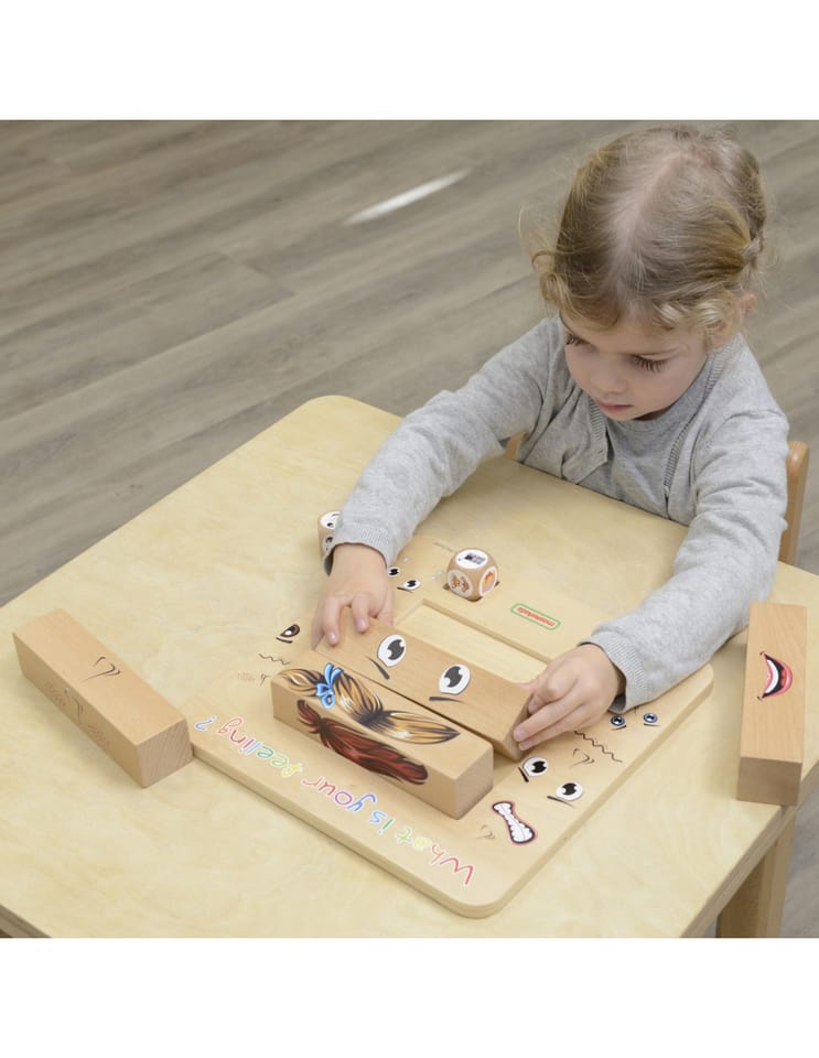 Tablica składa się z 4 bloków, za pomocą których dziecko może ułożyć aż 64 różne twarze wyrażające inne uczucia. Ćwiczenia wykonywane z pomocą tej tablicy dają ogromne możliwości nauczenia dzieci prawidłowego zarządzania emocjonalnego, jak sobie radzić ze swoimi emocjami, co one oznaczają. Produkt nadaje się do pracy indywidualnej, zarówno w domu, jak i w specjalistycznych gabinetach.