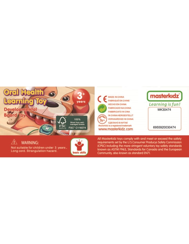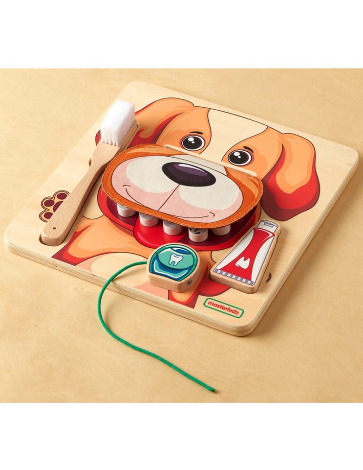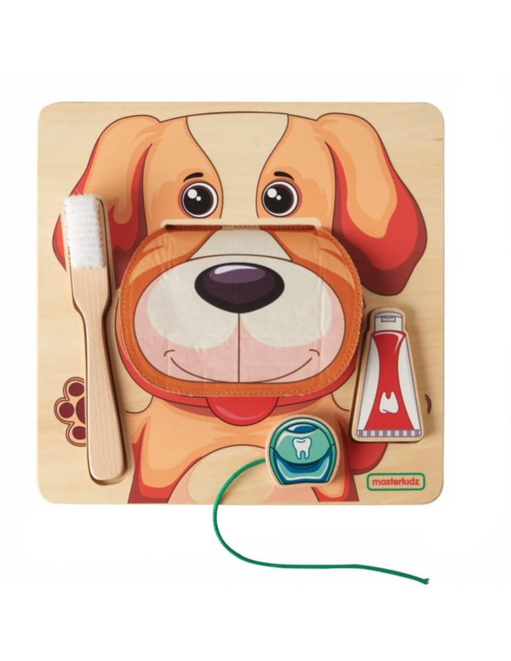 Ta edukacyjna tablica łączy zabawę w czyszczenie zębów psa z nauką o higienie jamy ustnej. Przedstawia przyjaznego psa z otwierającym się pyszczkiem, odsłaniającym 10 zębów. Zestaw zawiera zabawkową pastę, szczoteczkę i nitkę do zębów. Dzieci mogą bawić się w czyszczenie zębów psa, wyciskając pastę na szczoteczkę, szorując i nitkując zęby, co rozwija ich motorykę i precyzję. Zabawka zachęca do rozmów o dbaniu o własne zęby, a także umożliwia zabawę samodzielnie lub w parach.