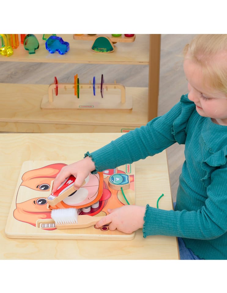 - - Drewniana tablica edukacyjna, która pomoże dziecku ćwiczyć szczotkowanie zębów i używanie nitki dentystycznej.