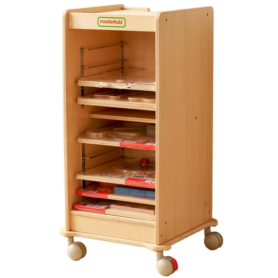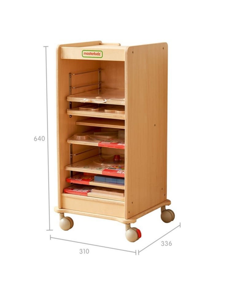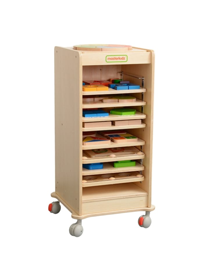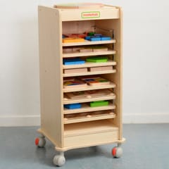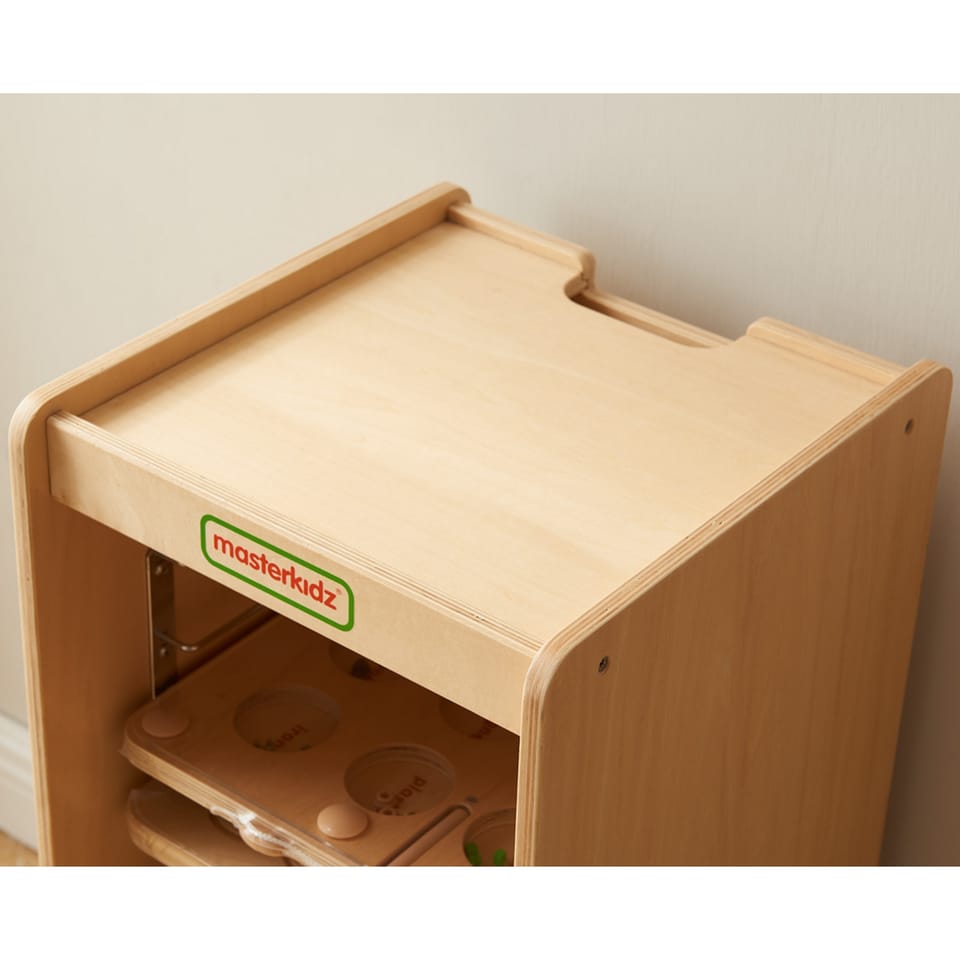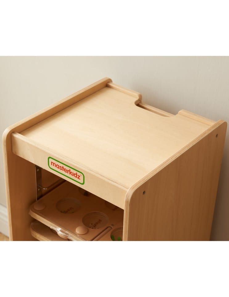 Drewniana szafeczka została zaprojektowana specjalnie w celu przechowywania ręcznych tabliczek Masterkidz. Mieści aż 10 sztuk o rozmiarach 28x28cm, więc jest to bardzo praktyczne rozwiązanie. Do szafeczki można dokupić kółka, dzięki którym przenoszenie szafeczki będzie dużo łatwiejsze, nawet gdy będzie pełna. Kółka można zablokować, by można było unieruchomić mebel, bez potrzeby demontowania kół.