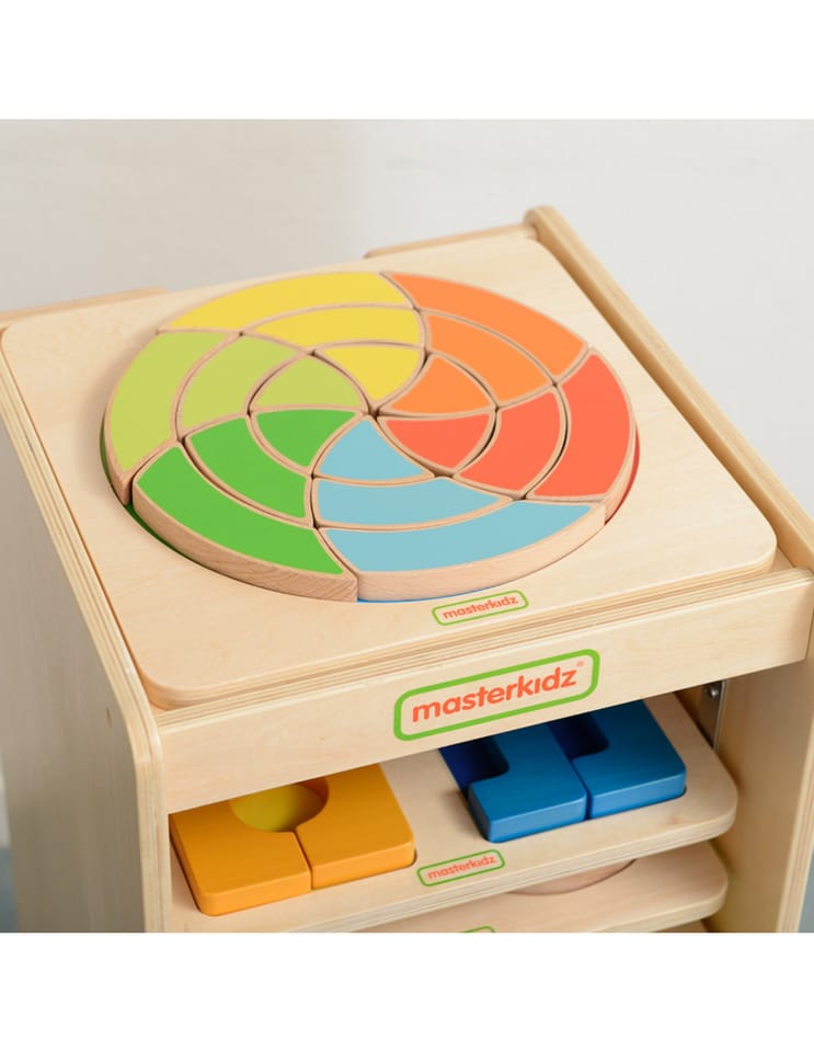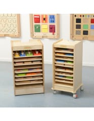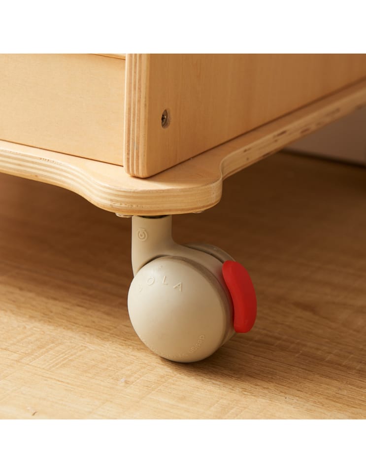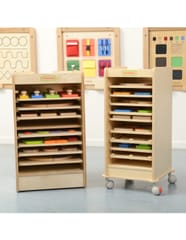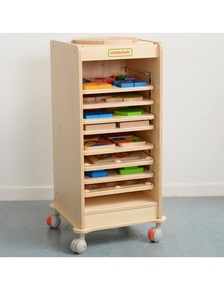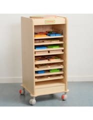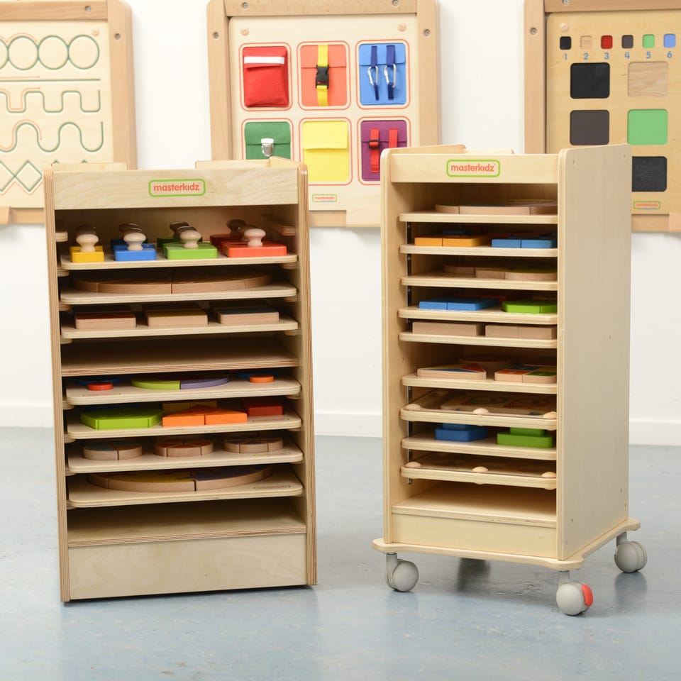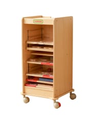 Drewniana szafeczka została zaprojektowana specjalnie w celu przechowywania ręcznych tabliczek Masterkidz. Mieści aż 10 sztuk o rozmiarach 28x28cm, więc jest to bardzo praktyczne rozwiązanie. Do szafeczki można dokupić kółka, dzięki którym przenoszenie szafeczki będzie dużo łatwiejsze, nawet gdy będzie pełna. Kółka można zablokować, by można było unieruchomić mebel, bez potrzeby demontowania kół.
