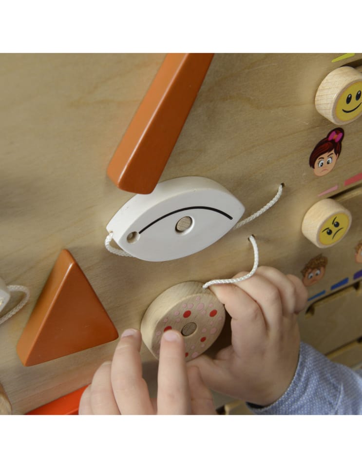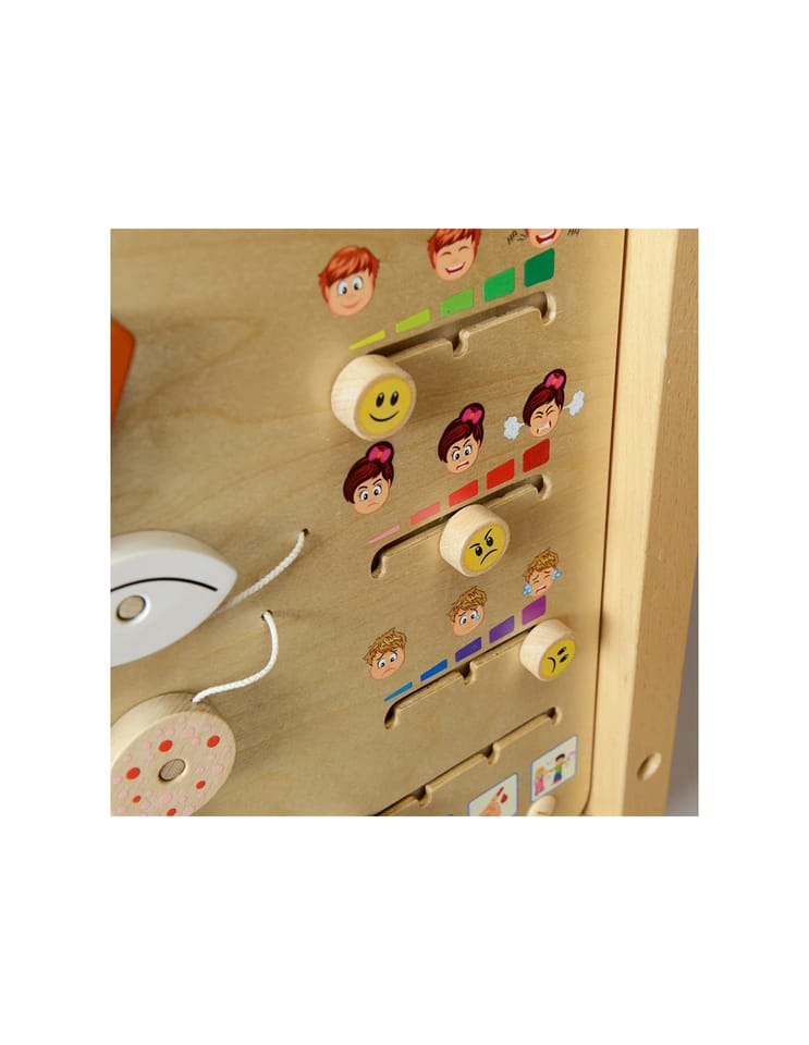 - - znajdują się również trzy wskaźniki emocji - szczęście, smutek i złość - dzieci pokazują emocje przesuwając drewniane kołki
