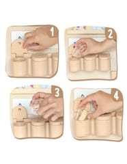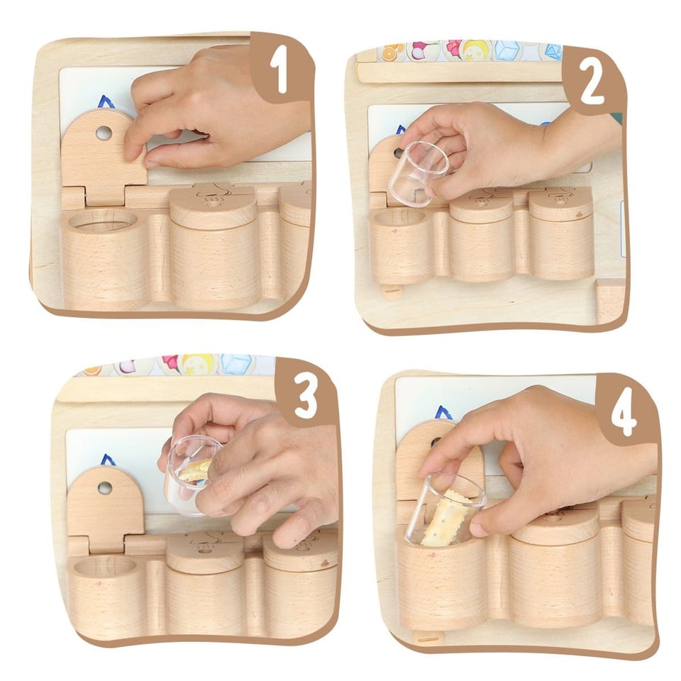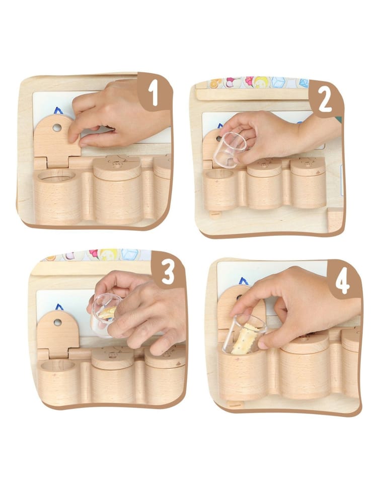- - na dole znajdują się trzy drewniane pojemniczki, z których każdy ma plastikową tackę, można na nich układać różne rzeczy, a następnie prosić dzieci o określenie zapachów produktów ukrytych pod przykryciem