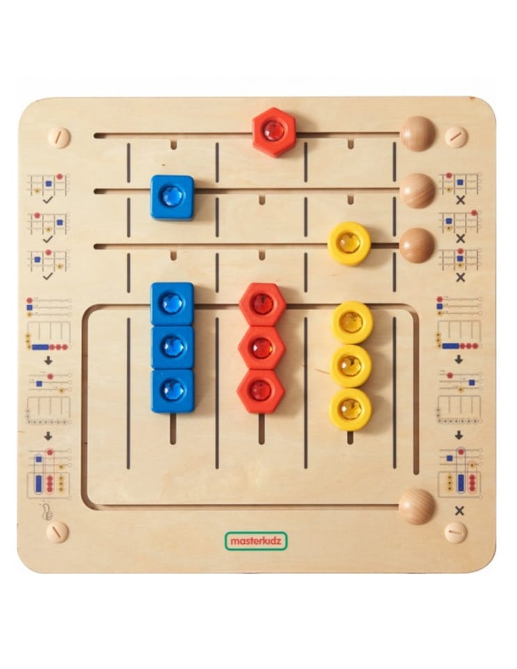 Ta tablica edukacyjna skupia się na rozpoznawaniu kształtów i motoryce małej. Jest podzielona na dwie części: górna zawiera pasek zadań, w którym dzieci muszą umieścić trzy kształty (czerwony sześciokąt, niebieski kwadrat i żółte koło) w odpowiednich miejscach. Dolna część planszy to trzy kolumny z 9 kształtami, które dzieci muszą dopasować do właściwych miejsc, koncentrując się na kolorze i kształcie. Elementy są umieszczone na tablicy w sposób umożliwiający ich łatwe przesuwanie, ale niemożliwe do zgubienia. Tablica może być używana na biurku lub zamontowana na ścianie.