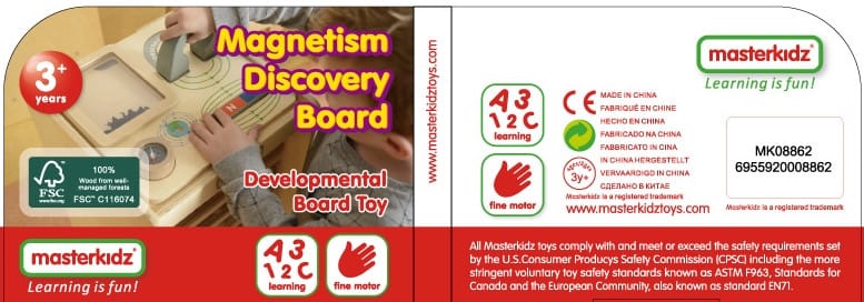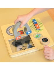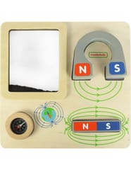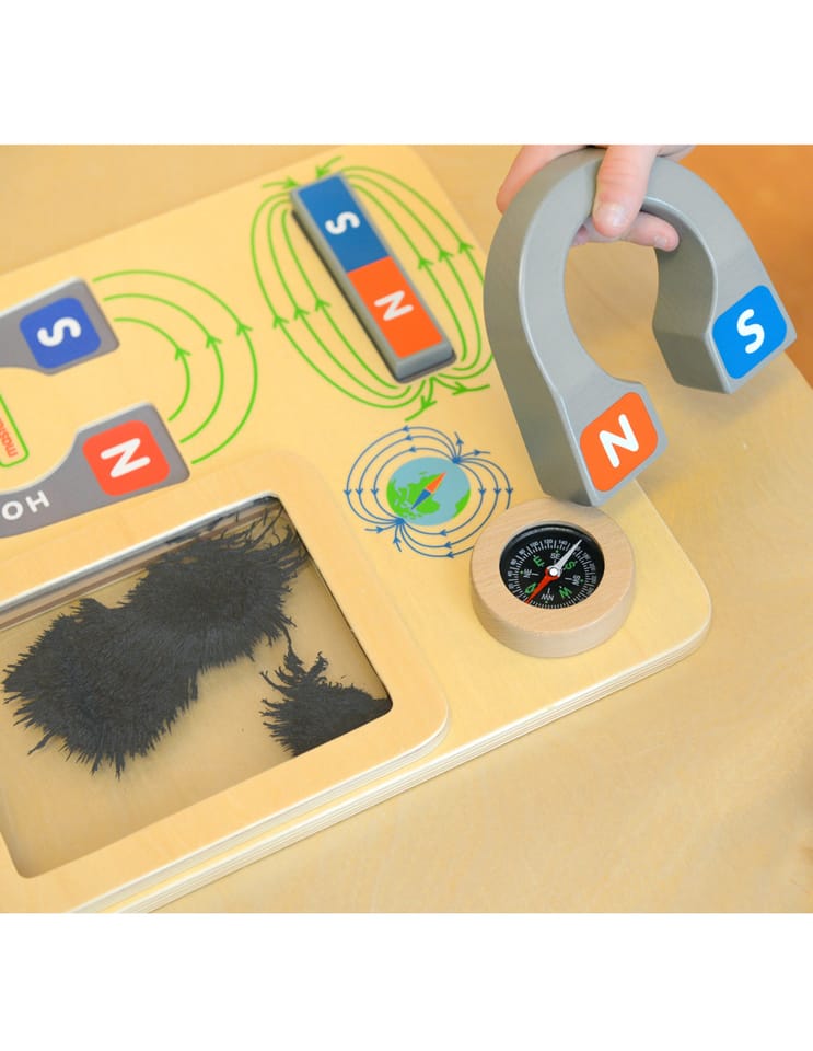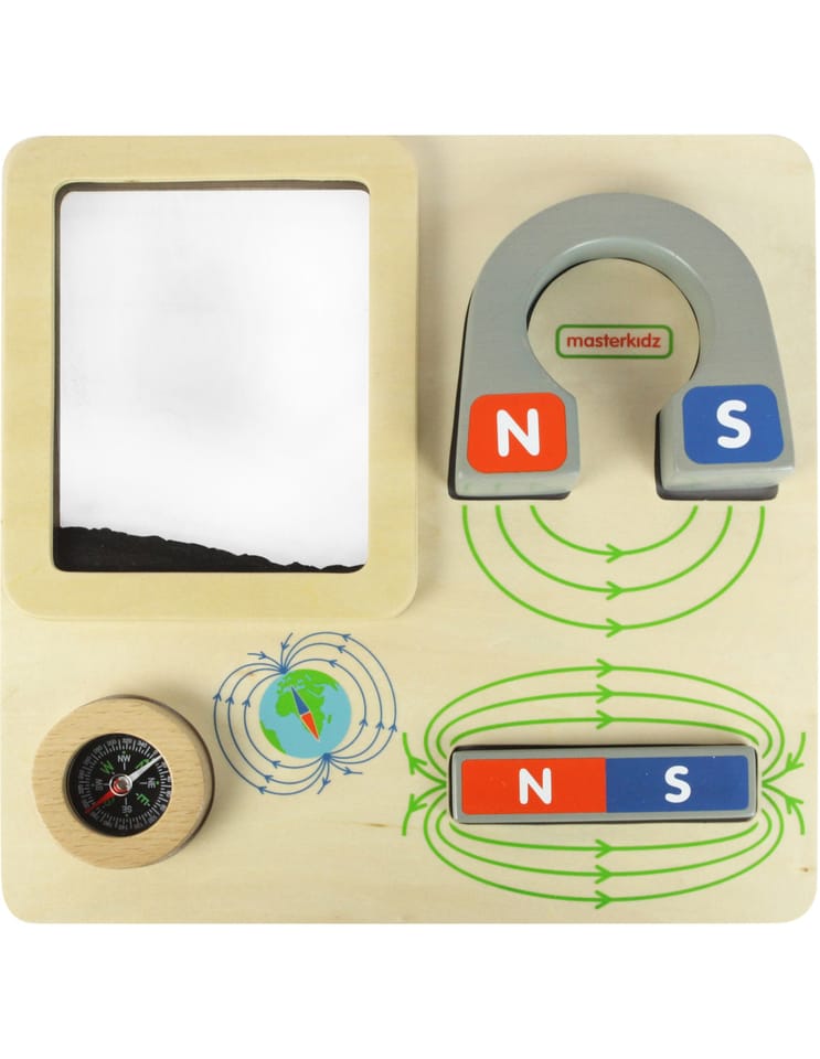 Drewniana tabliczka edukacyjna, dzięki której dziecko będzie mogło na własne oczy zobaczyć jak działa magnes. Zabawka zawiera duży magnes w kształcie podkowy, z oznaczonymi biegunami, a także magnes w kształcie bloczka. Na tabliczce znajduje się również pojemniczek z opiłkami żelaza. Przyciągając je, dziecko może obserwować linie magnetyczne. Zabawka posiada również kompas.
