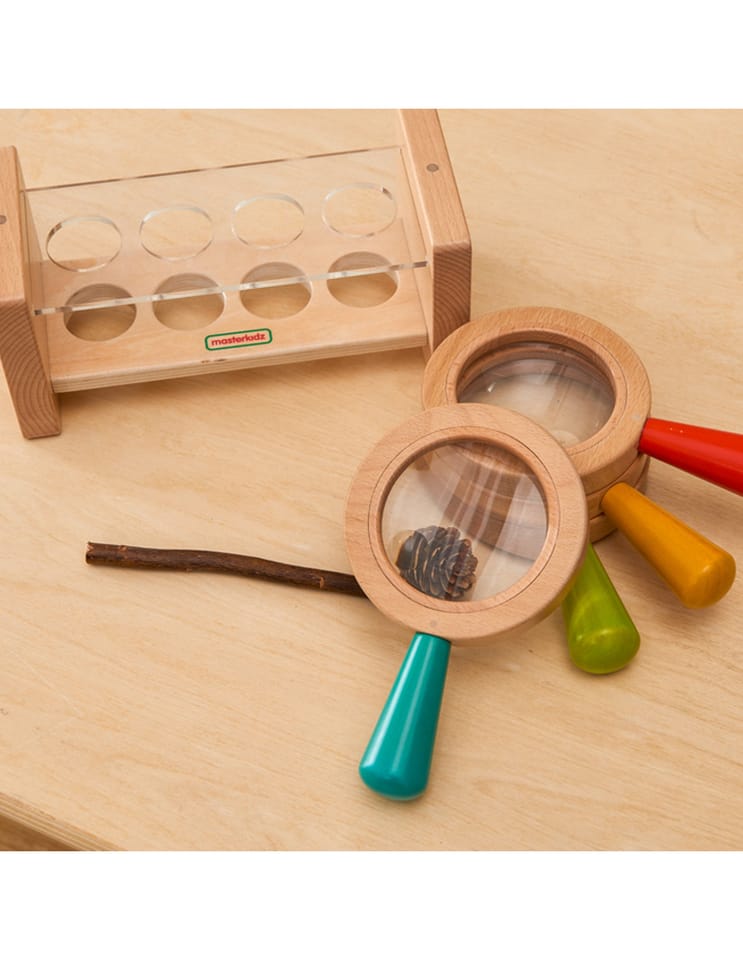 ✔️4 lupy z drewnianymi uchwytami w różnych kolorach✔️Solidny, drewniany stojak z przezroczystą pokrywą✔️ Powiększenie umożliwiające dokładną obserwację✔️Bezpieczne materiały, idealne dla dzieci✔️Wspiera ciekawość, naukę przez zabawę i rozwija zmysł obserwacji