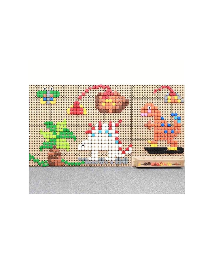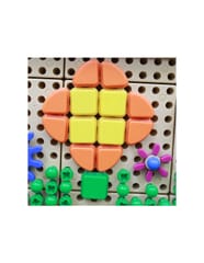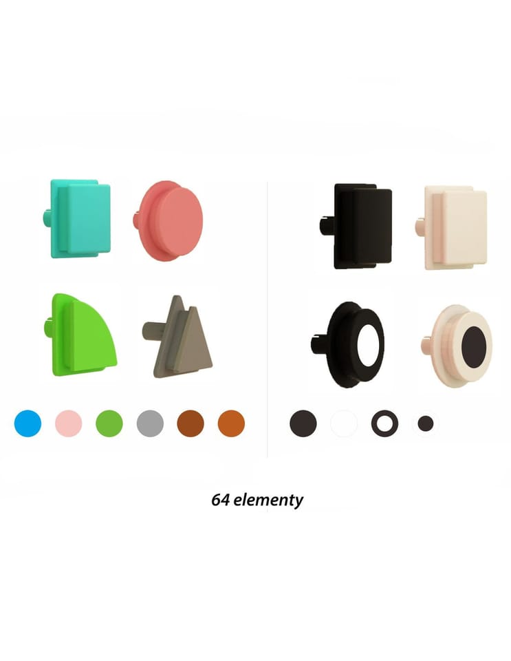 - - Zestaw zawiera 64 kołeczki w 4 różnych kształtach geometrycznych: kwadrat, koło, trójkąt oraz ćwierć kole