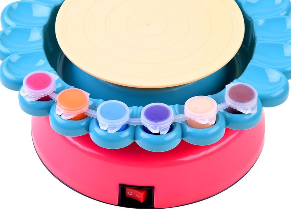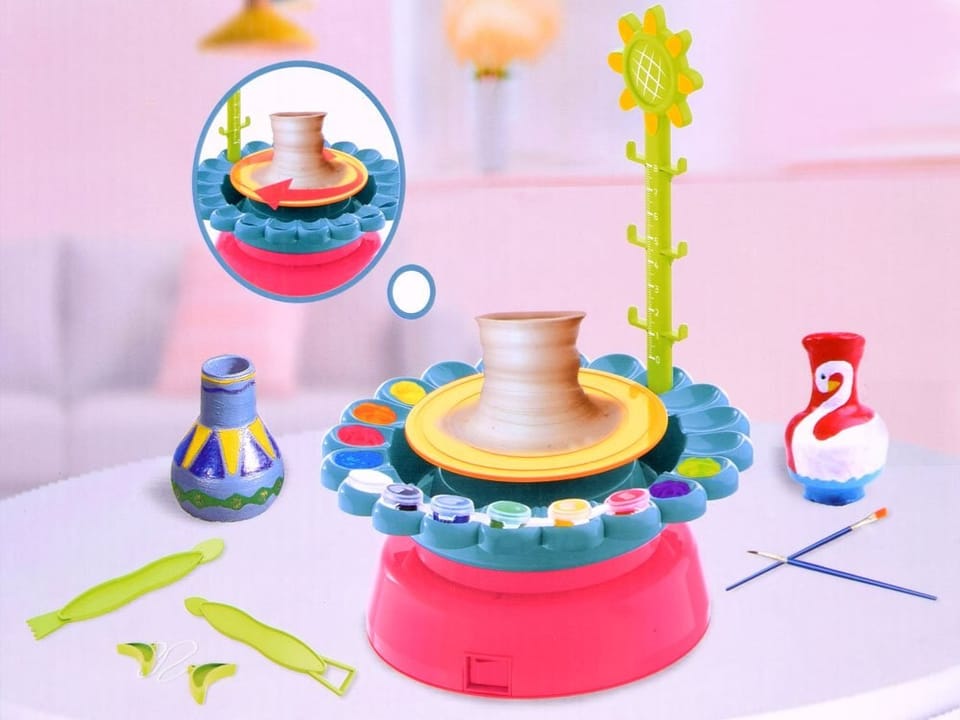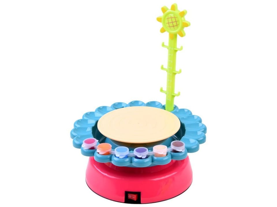 Koło garncarskie to świetny pomysł na prezent dla dzieci kreatywnie lubiących spędzać czas. Zabawka jest idealna dla wszystkich lubiących prace manualne oraz nie bojących się trochę pobrudzić. Za pomocą tej wspaniałej maszyny można wyczarować z gliny ciekawe rzeczy (np. wazony, dzbanki, doniczki, talerzyki, kubeczki) a za pomocą plastikowych nożyków oraz pędzelków i farbek pięknie je ozdobić. Fartuszek ochronny ma zapobiegać nadmiernemu pobrudzeniu się przez małego artystę.