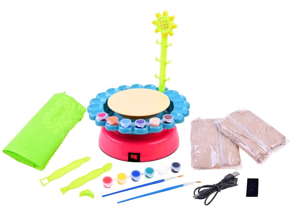 Zestaw zawiera:- koło garncarskie- glinę 270g 2 szt.- farby 12 kolorów- pędzelki do malowania 2 szt.- narzędzia do rzeźbienia 2szt.- fartuszek- miarkę- sznurek do odcinania z uchwytami- kabelek do ładowania z wejściem USB- instrukcję w języku angielskim