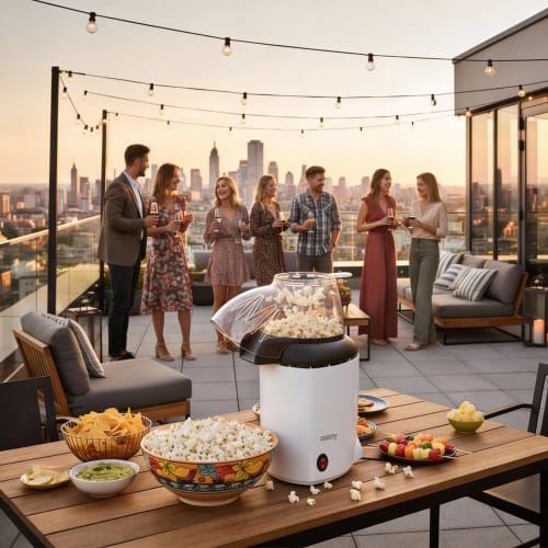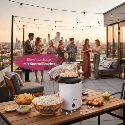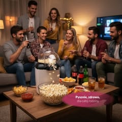 Maszyna do popcornu Urządzenie dla osób, które w czasie długich filmowych seansów, lubią zajadać się pysznym, pachnącym popcornem. Prażona kukurydza przygotowana za pomocą tej nowoczesnej maszyny jest też zdrowa, ponieważ nie trzeba używać oleju. Antypoślizgowe gumowe nóżki pozwalają na umieszczenie urządzenia na dowolnej powierzchni. Dodatkowym atutem jest krótki czas przygotowania popcornu (tylko 2,5 minuty!). Specyfikacja techniczna czas przygotowania popcornu 2,5 minuty moc 1200 W waga 0,8 kg wymiary opakowania 22 x 23.5 x 14.5 cm Dodatkowe informacje popcorn bez użycia oleju i tłuszczu przezroczysta pokrywa z pojemnikiem do odmierzania porcji włącznik / wyłącznik z lampką kontrolną