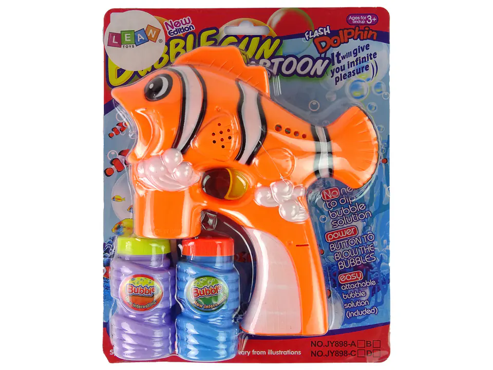 Niesamowite bańki mydlane w zestawie z uroczym pistoletem w kształcie pomarańczowej rybki! W tym fantastycznym zestawie otrzymasz plastikową maszynkę do baniek mydlanych, 2 buteleczki płynu oraz instrukcję w języku angielskim.