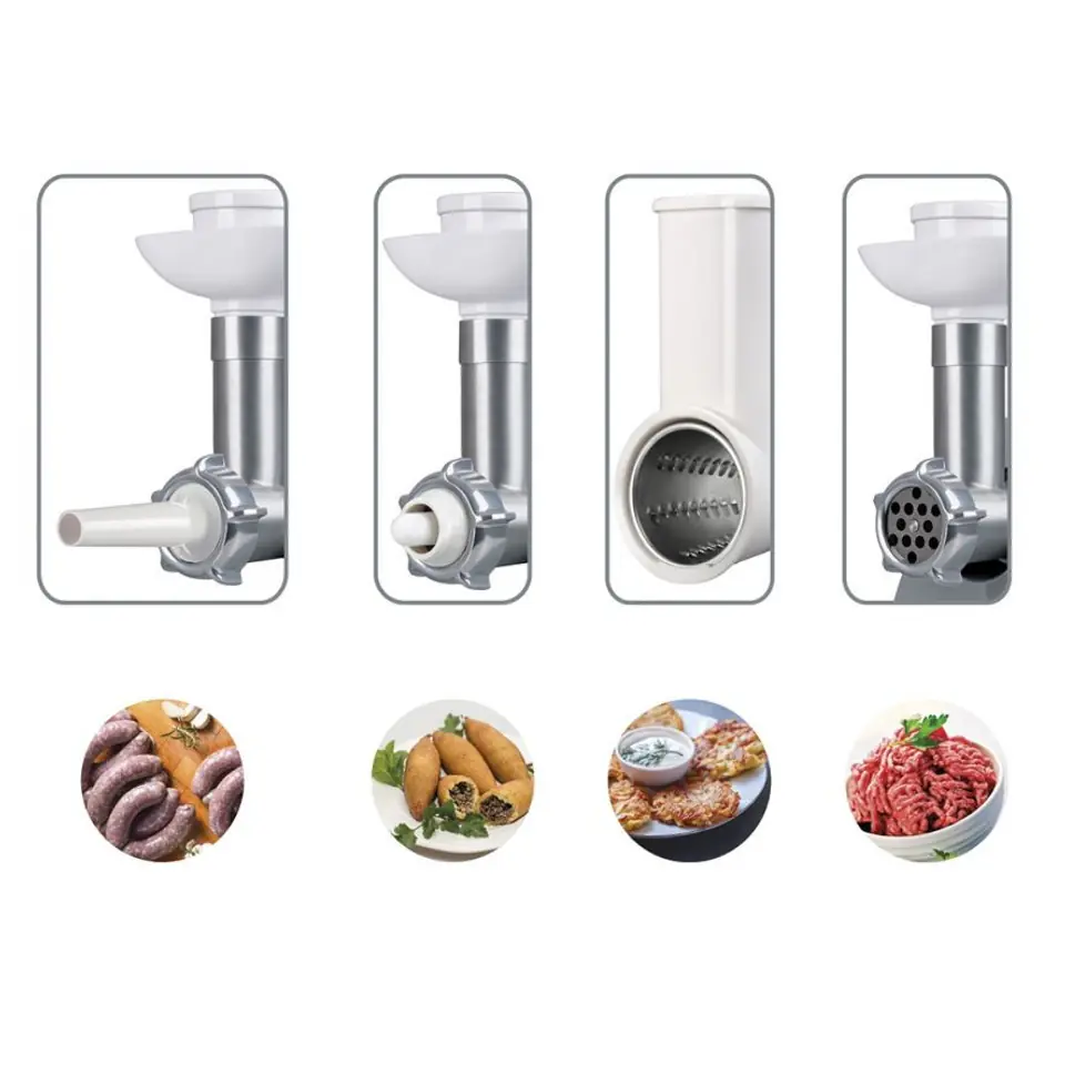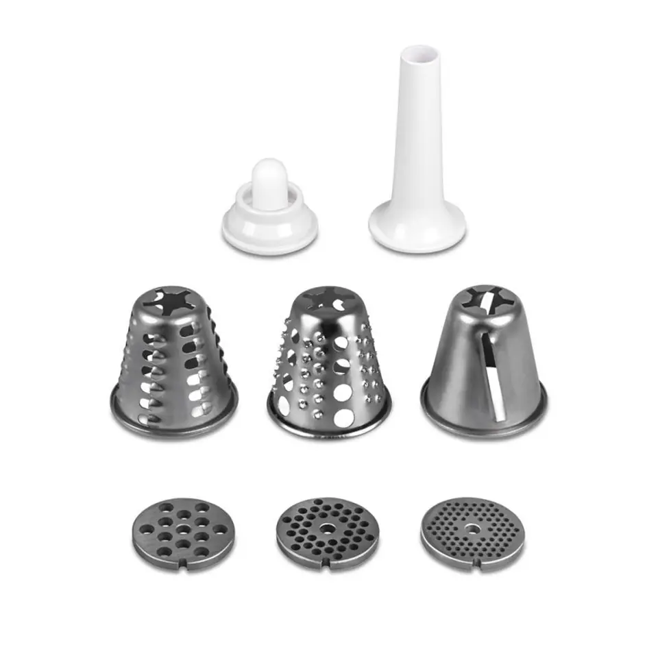 - bogate wyposażenie: 3 sita (3 mm, 5 mm, 8 mm)+ 3 tarki (do ziemniaków, grube wiórki, plastry)+ zestaw do kebbe+ zestaw masarski