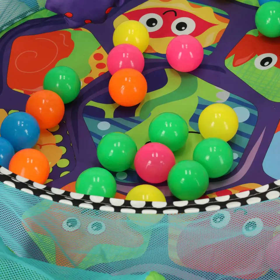 Mata posiada przymocowaną siatkę, która po rozłożeniu tworzy basen, idealny do zabawy z piłeczkami i zabawkami.
