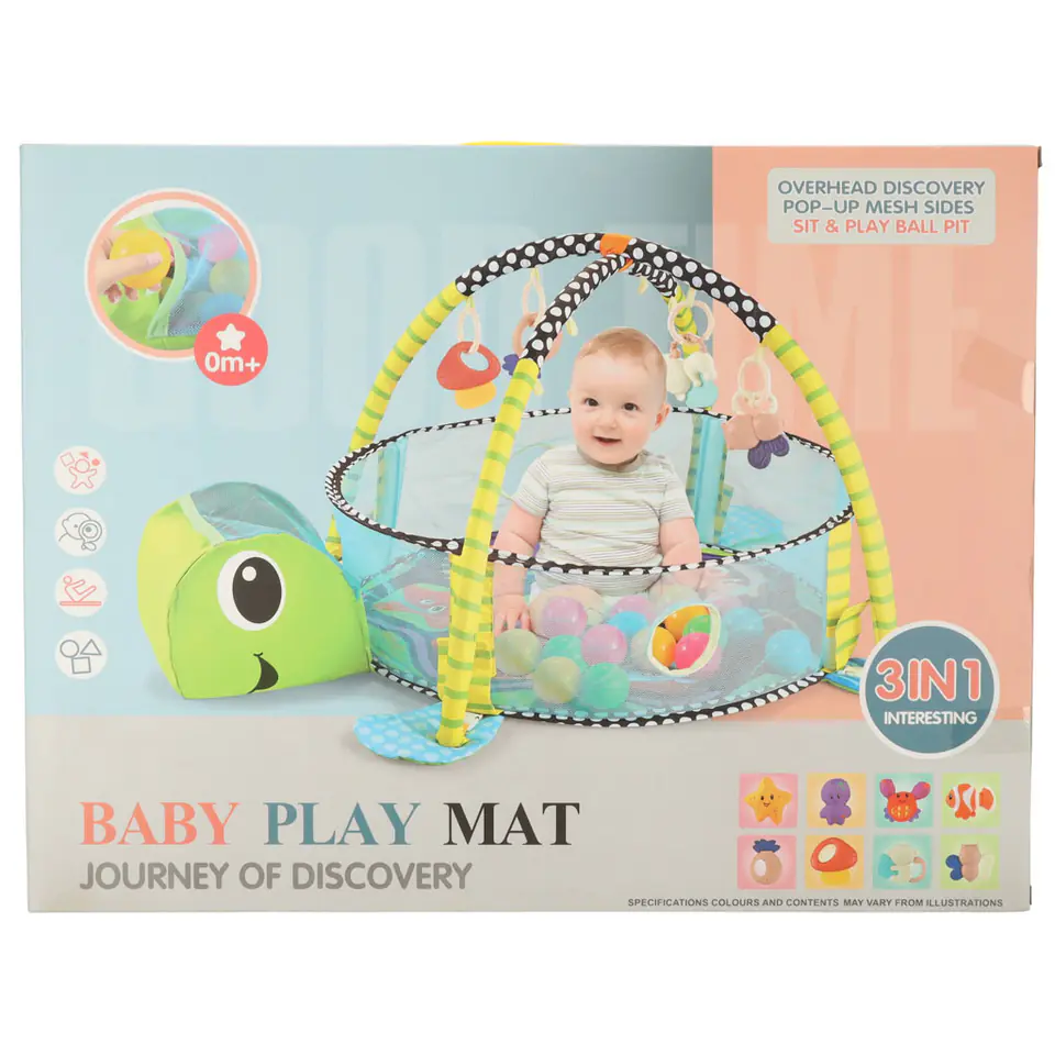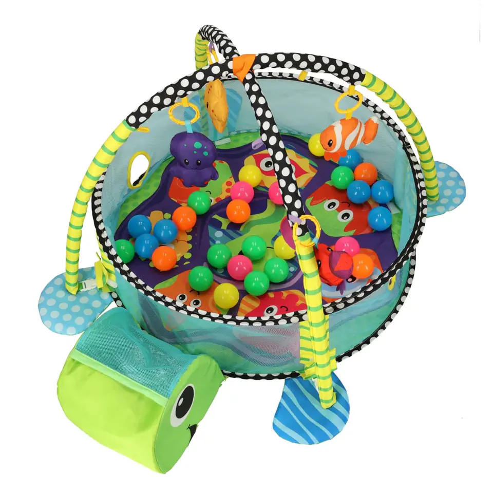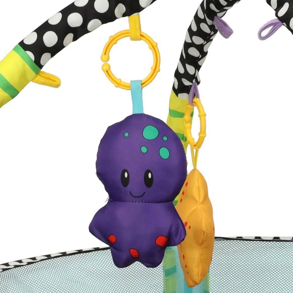 Do maty dołączone są kolorowe i miękkie zabawki, takie jak rybka, ośmiornica, gwiazda i krab z lusterkiem. Dodatkowo 30 plastikowych piłeczek w żywych kolorach stymulują zmysły dziecka.