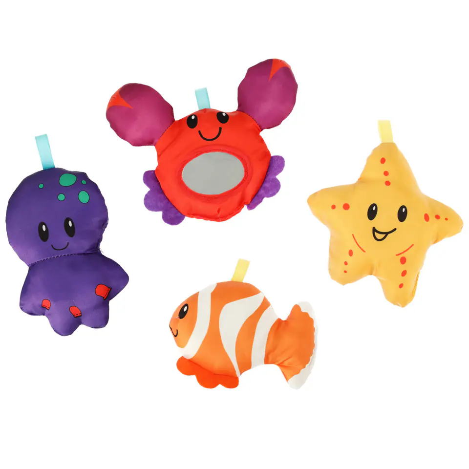 Zabawki w postaci rybki, ośmiornicy, gwiazdy i kraba z lusterkiem