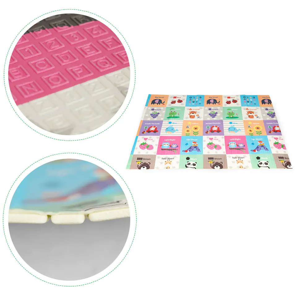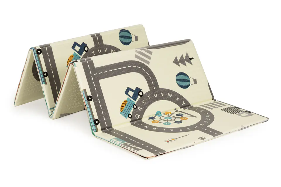 Po jednej stronie maty znajduje się wzór ulic, który zachęca do zabawy pojazdami i rozwijania zdolności manualnych. Po odwróceniu maty na drugą stronę, maluchy mogą odkrywać kolorowe wzory zwierząt, owoców oraz cyfr, co wspomaga rozwijanie wyobraźni a także stymuluje rozwój dziecka.