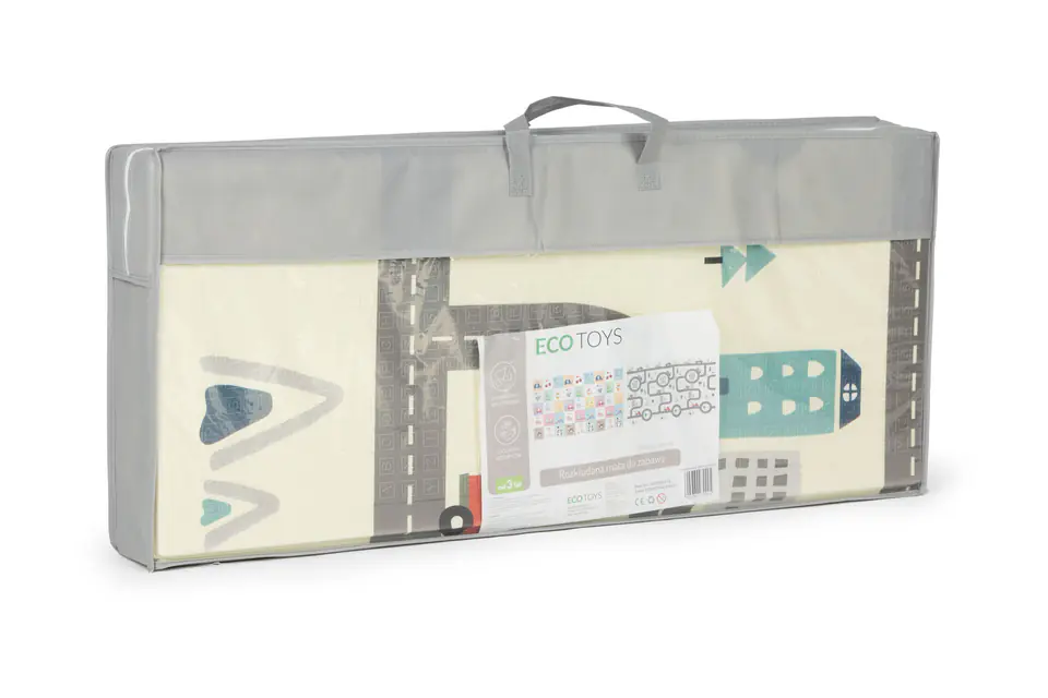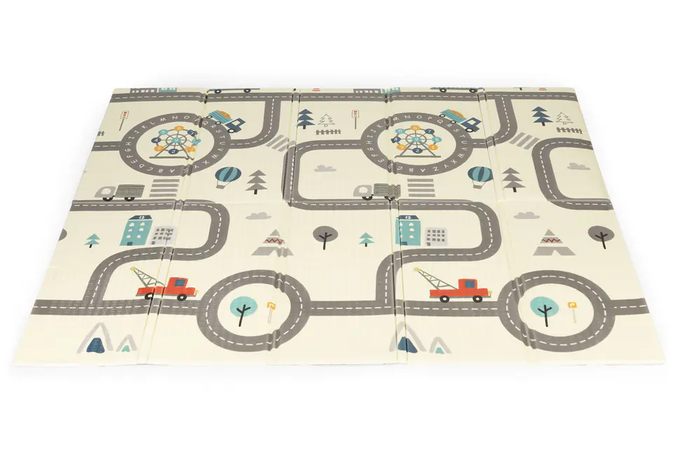 Mata jest wyjątkowo praktyczna, można ją łatwo składać i rozkładać, co ułatwia jej przechowywanie oraz przenoszenie. Dwie strony zapewnią mnóstwo dobrej zabawy, z jednej strony znajduje się grafik miasta z ulicami, z drugiej zaś umieszczone są kolorowe grafiki przedstawiające różne zwierzątka i owoce.