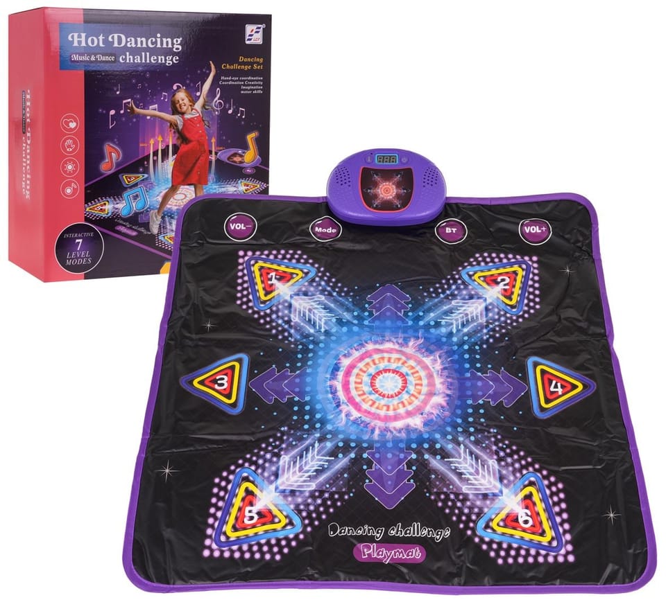 Mata do tańca z Bluetooth, oświetleniem i podgrzewaniem dla dzieci powyżej 3-go roku życia. Jest miękka i kolorowa, od spodu posiada warstwę antypoślizgową. Środek maty może nagrzewać się do 45 stopni by ogrzać zmarznięte stopy Twojej pociechy. Mata działa w 5 trybach: swobodnego tańca, gaszenia światełek na macie (tryb 2 i 3), pamięciowym i perkusyjnym. Możemy połączyć matę z telefonem przez Bluetooth. Mata zasilana jest akumulatorem typu 7,4 V 1800 mAh (w zestawie). Opis trybów maty:Tryb 1Tryb swobodnego tańca ze wbudowanymi 3 utworami.Tryb 2W tym trybie mamy 3 poziomy trudności, każda runda po 1 minucie. Należy gasić światełka podświetlane przez matę.Tryb 3 W tym trybie mamy 6 poziomy trudności, każda runda po 1 minucie. Należy gasić światełka podświetlane przez matę.Tryb 4 Tryb pamięci, gracz musi powtórzyć sekwencje kolorowych świateł.Tryb 5Tryb perkusji. Naciskając w poszczególne numery, usłyszymy 6 dźwięków perkusji. Funkcje maty:- odpowiednia dla dzieci powyżej 3-go roku życia,- wybór języka (angielski, niemiecki, hiszpański),- regulacja głośności,- tryb swobodnego tańca ze wbudowanymi 3 utworami (tryb 1),- tryb gaszenia światełek na macie (tryb 2 i 3),- tryb pamięci, gracz musi powtórzyć sekwencję kolorowych światełek,- 6 dźwięków perkusji,- funkcja grzania do 45 stopni,- możliwość połączenia maty przez bluetooth,- tryb oszczędzania baterii, automatyczne wyłączenie po 5 minutach bezczynności. | |