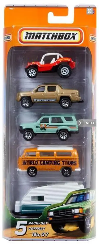 Klasyczny Matchoboxowy pięciopak zawiera zestaw pięciu szczegółowo odlanych pojazdów w dwunastu różnych wariantach. Modele i kolory mogą się różnić. Towar wybierany losowo.