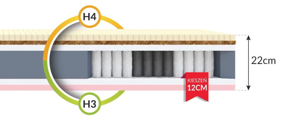 Materac multipocketowy FORZA Sprężyny multipocket , 510 sprężyn/m², lateks, pianka memory, pianka, kokos, pokrowiec do prania - 140 x 200 - H4 twardy / H3 średnio twardy - 22 cm
