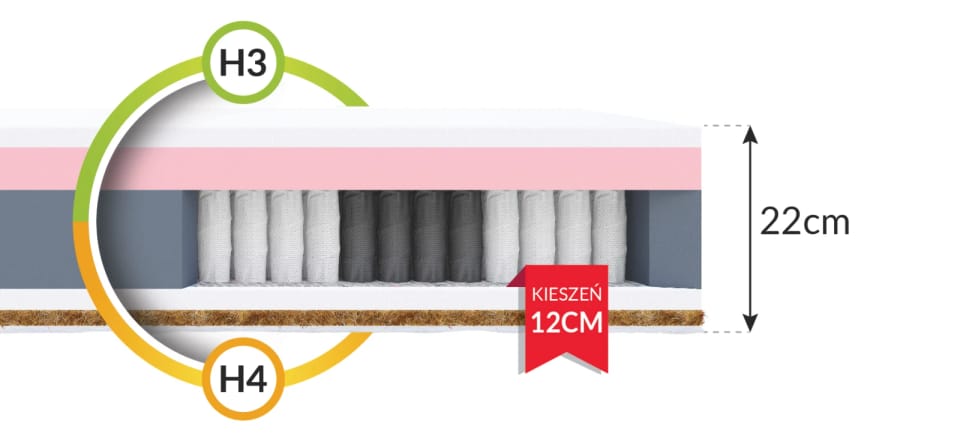 Materac multipocketowy IVREA Sprężyny multipocket , 510 sprężyn/m², pianka memory, pianka, kokos, pokrowiec do prania - 180 x 200 - H4 twardy / H3 średnio twardy - 28 cm