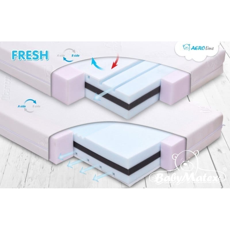 Pokrowiec : 2-stronny rozdzielczy zamek 360° - możliwość użytkowania jednej strony podczas prania drugiego Trój-warstwowa, dzianina żakardowa z efektem 3D delikatna dzianina bambusowa Certyfikat najwyższej klasy bezpieczeństwa dla niemowląt Zamek błyskawiczny z bezpiecznym suwakiem Wypełnienie : 4- warstwowa konstrukcja materaca. Warstwa usztywniająca i wydłużająca żywotność materaca Strona A: Innowacyjna „poduszka powietrzna" z włókien 3D dla ciągłej cyrkulacji powietrza bezpośrednio pod ciałem dziecka kolumny masujące dopasowujące się do kształtu ciała. Bardzo wysoka elastyczność punktowa. Bardzo wysoka gęstość i sprężystość pianki głównej Poprzeczne kanały wentylacyjne o budowie „cyrkulacja non- stop" boczne belki stabilizujące 360° o zwiększonej twardości - niwelują ryzyko skręcenia kostki dziecka Strona B: Siedem stref twardości dla optymalnego rozłożenia masy na powierzchni materaca Poprzeczne kanały wentylacyjne z poziomym doprowadzeniem powietrza Ramowe łączenie elementów dla zwiększenia elastyczności. Certyfikowany klej nierozpuszczalnikowy, przeznaczony do kontaktu z dziećmi Certyfikat najwyższej klasy bezpieczeństwa Oeko Tex posiada status wyrobu medycznego Rozmiar: 60 x 120 x 10 cm Skład surowcowy : Pokrowiec : Strona A: 33% bawełna, 33% PES, 34% PA Strona B: 31% bambus, 69% PES Wypełnienie : pianka poliuretanowa dzianina 3D- 100% PES