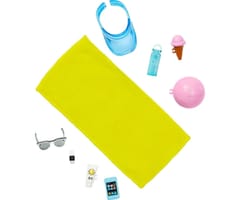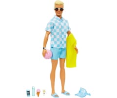 Czas na relaks w słońcu z Kenem Barbie, gotowym na idealny dzień na plaży w Malibu!Ken ma na sobie niebiesko-białą koszulę w kratę, dopasowane błękitne szorty kąpielowe i błyszczące klapki z logo Ken, tworząc stylowy, wakacyjny styl.W zestawie znajduje się wszystko, co potrzebne do letniej zabawy: daszek przeciwsłoneczny, okulary, zegarek, ręcznik, butelka na wodę, krem do opalania, smartfon, piłka plażowa i rożek lodowy, który można przypiąć do dłoni lalki.Ten zestaw inspiruje do tworzenia wielu słonecznych, wakacyjnych historii!Dane produktu: