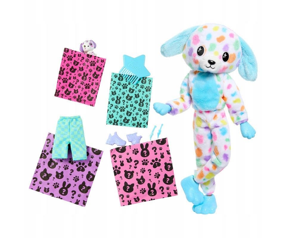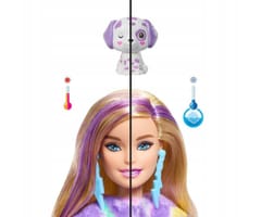Lalki Barbie Cutie Reveal Color Dream to aż 10 niespodzianek w jednym opakowaniu i wyjątkowa zabawa już od momentu rozpakowywania. W środku czeka pluszowy dalmatyńczyk w kolorowym stroju w kropki, pod którym ukryta jest modna lalka Barbie z długimi blond włosami z fioletowymi pasemkami. Zestaw oferuje stylizację, zabawę akcesoriami oraz magiczne efekty zmiany koloru. Zabawka rozwija wyobraźnię i zachęca do kreatywnej zabawy w stylizowanie oraz odkrywanie niespodzianek.Najważniejsze cechy: