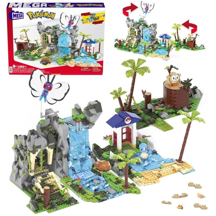 Wymiary po złożeniu to około 40 cm szerokości, 25 cm głębokości i 25 cm wysokości, co sprawia, że zestaw imponuje rozmiarem i daje mnóstwo miejsca na zabawę. Można go również łączyć z innymi zestawami z serii MEGA Pokémon -Konstruktor Przygód, tworząc rozbudowany świat pełen leśnych ścieżek, wodospadów, ukrytych świątyń i niespodzianek.Najważniejsze cechy produktu: