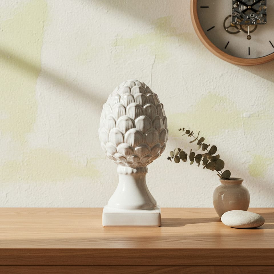 Poznaj figurkę Hytte - ceramiczną szyszkę, która doda elegancji i uroku Twojemu wnętrzu. Wykonana z wysokiej jakości ceramiki, w klasycznym białym kolorze, doskonale wpasuje się w różnorodne aranżacje, od nowoczesnych po rustykalne. Ta nietuzinkowa statuetka będzie pięknie prezentować się na komodzie, półce czy parapecie, stanowiąc wyjątkowy akcent dekoracyjny. Idealna jako element dekoracji świątecznej, nada wnętrzu ciepły, przytulny klimat. Świetnie sprawdzi się również jako ozdoba na tarasie czy balkonie, wprowadzając naturalny akcent do przestrzeni zewnętrznych. Możesz jej użyć jako centralnego punktu dekoracyjnego na stole podczas przyjęć, zachwycając gości oryginalnością. Wybierz figurkę Hytte i ciesz się jej elegancją oraz wszechstronnością każdego dnia.Wymiary:12*12*24.5