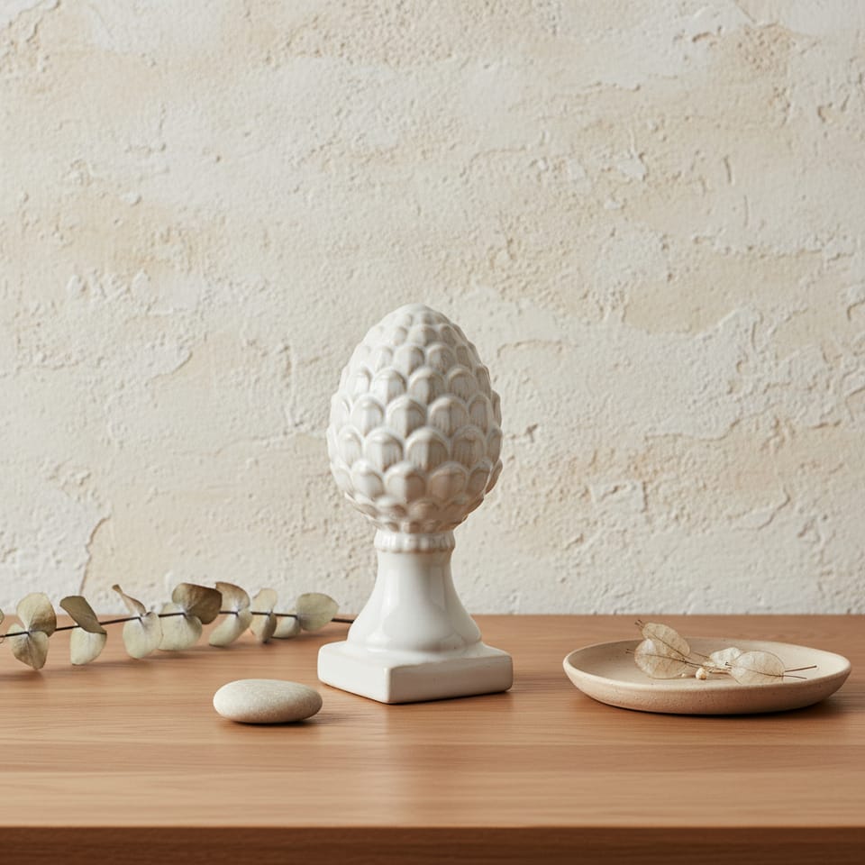Poznaj figurkę Hytte - ceramiczną szyszkę, która doda elegancji i uroku Twojemu wnętrzu. Wykonana z wysokiej jakości ceramiki, w klasycznym białym kolorze, doskonale wpasuje się w różnorodne aranżacje, od nowoczesnych po rustykalne. Ta nietuzinkowa statuetka będzie pięknie prezentować się na komodzie, półce czy parapecie, stanowiąc wyjątkowy akcent dekoracyjny. Idealna jako element dekoracji świątecznej, nada wnętrzu ciepły, przytulny klimat. Świetnie sprawdzi się również jako ozdoba na tarasie czy balkonie, wprowadzając naturalny akcent do przestrzeni zewnętrznych. Możesz jej użyć jako centralnego punktu dekoracyjnego na stole podczas przyjęć, zachwycając gości oryginalnością. Wybierz figurkę Hytte i ciesz się jej elegancją oraz wszechstronnością każdego dnia.Wymiary:7.5*7.5*15.9