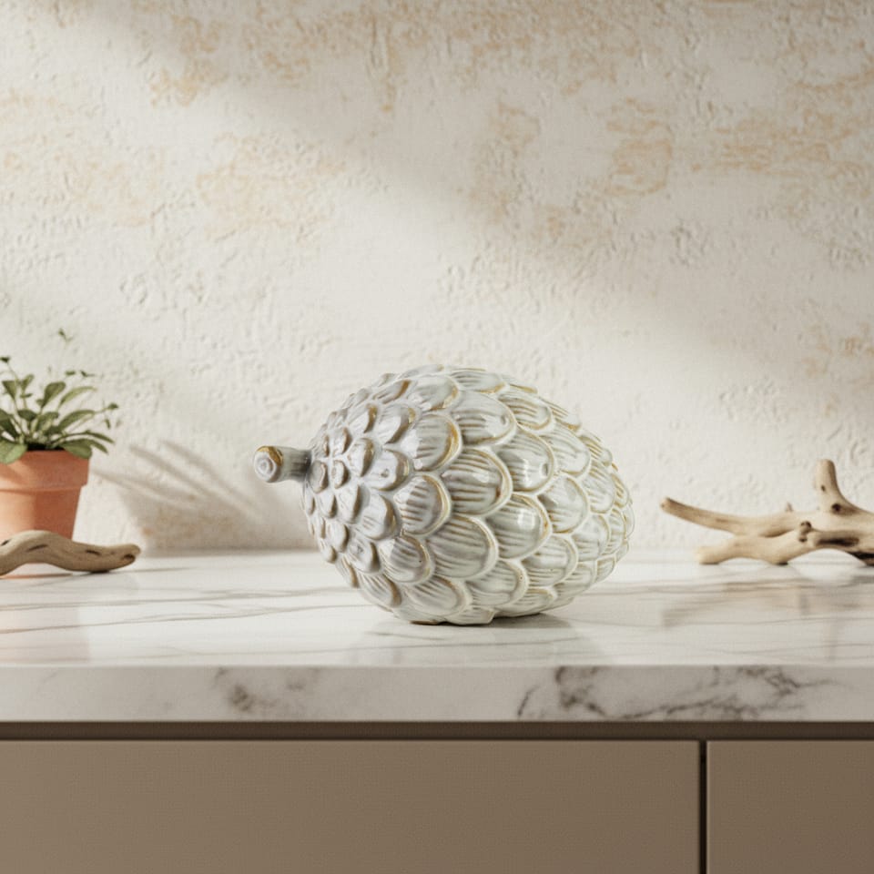 Poznaj figurkę Hytte - ceramiczną szyszkę, która doda elegancji i uroku Twojemu wnętrzu. Wykonana z wysokiej jakości ceramiki, w klasycznym białym kolorze, doskonale wpasuje się w różnorodne aranżacje, od nowoczesnych po rustykalne. Ta nietuzinkowa statuetka będzie pięknie prezentować się na komodzie, półce czy parapecie, stanowiąc wyjątkowy akcent dekoracyjny. Idealna jako element dekoracji świątecznej, nada wnętrzu ciepły, przytulny klimat. Świetnie sprawdzi się również jako ozdoba na tarasie czy balkonie, wprowadzając naturalny akcent do przestrzeni zewnętrznych. Możesz jej użyć jako centralnego punktu dekoracyjnego na stole podczas przyjęć, zachwycając gości oryginalnością. Wybierz figurkę Hytte i ciesz się jej elegancją oraz wszechstronnością każdego dnia.Wymiary:17.2*12*11