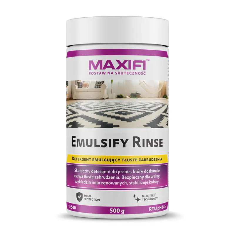 Maxifi Emulsify Rinse to niezwykle delikatny i skuteczny detergent do prania ekstrakcyjnego. Służy do wypłukiwania wcześniej zaaplikowanego pre-spraya który rozpuścił już brud. pH 8,5 sprawia że produkt jest bardzo bezpieczny dla starych, kolorowych tkanin i stabilizuje ich kolor. Nadaje się nawet do tak delikatnych materiałów jak dywany wełniane, czy impregnowane wykładziny. Używamy go zawsze przy samochodach starszych, oraz w przypadku gdy chcemy tylko odświeżyć tapicerkę, a do czyszczenia wstępnego zastosowaliśmy delikatny pre-spray o niskim pH.