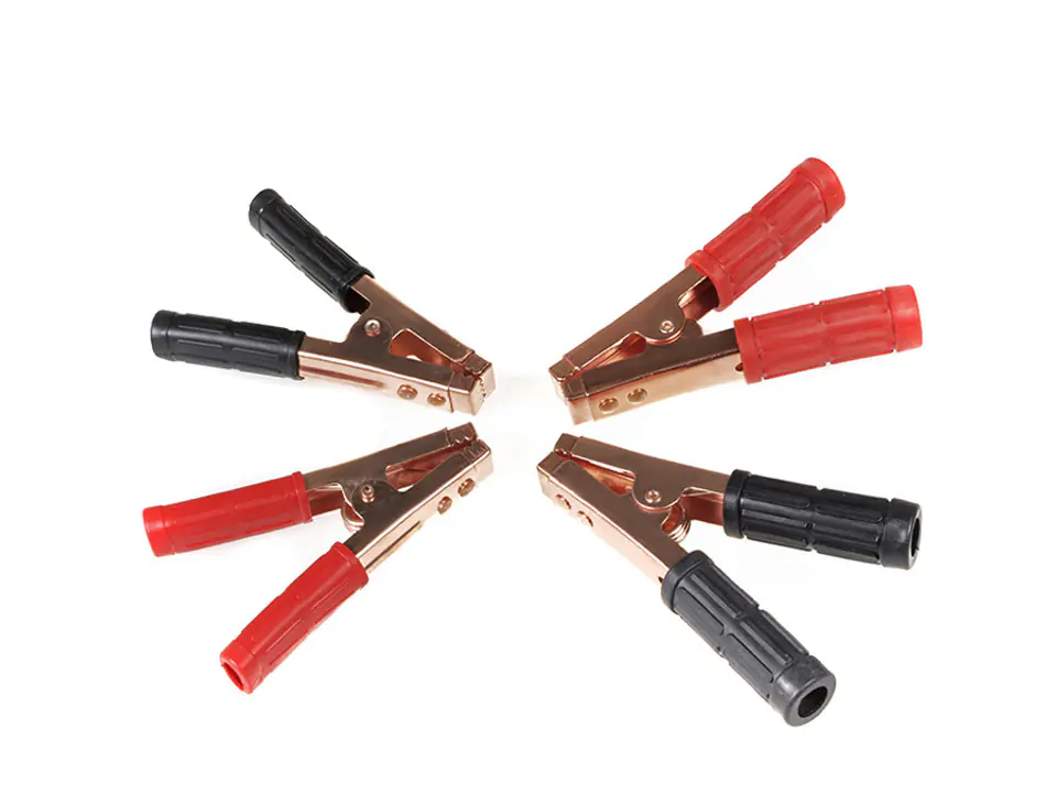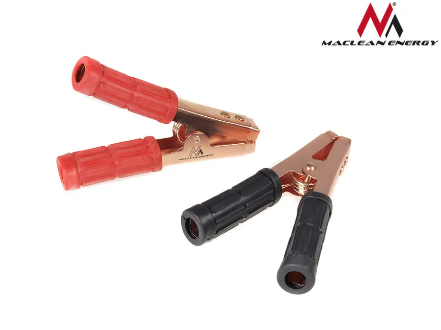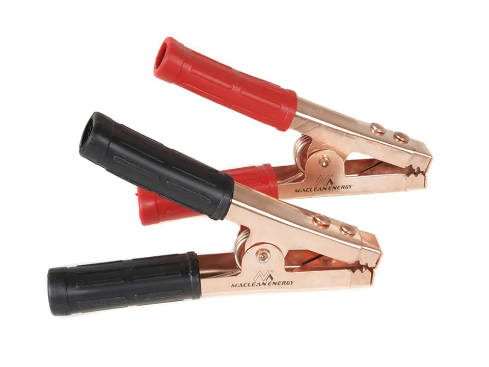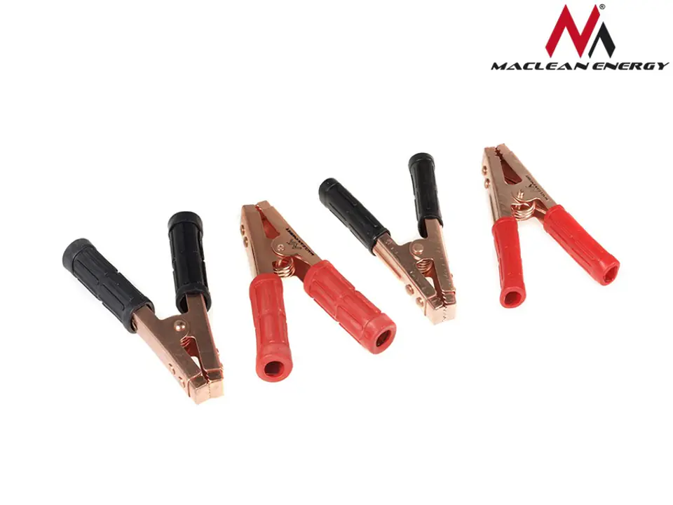 Wysokiej jakości krokodylki o dopuszczalnej obciążalności do 400A firmy Maclean Energy do zarobienia na przewodzie.