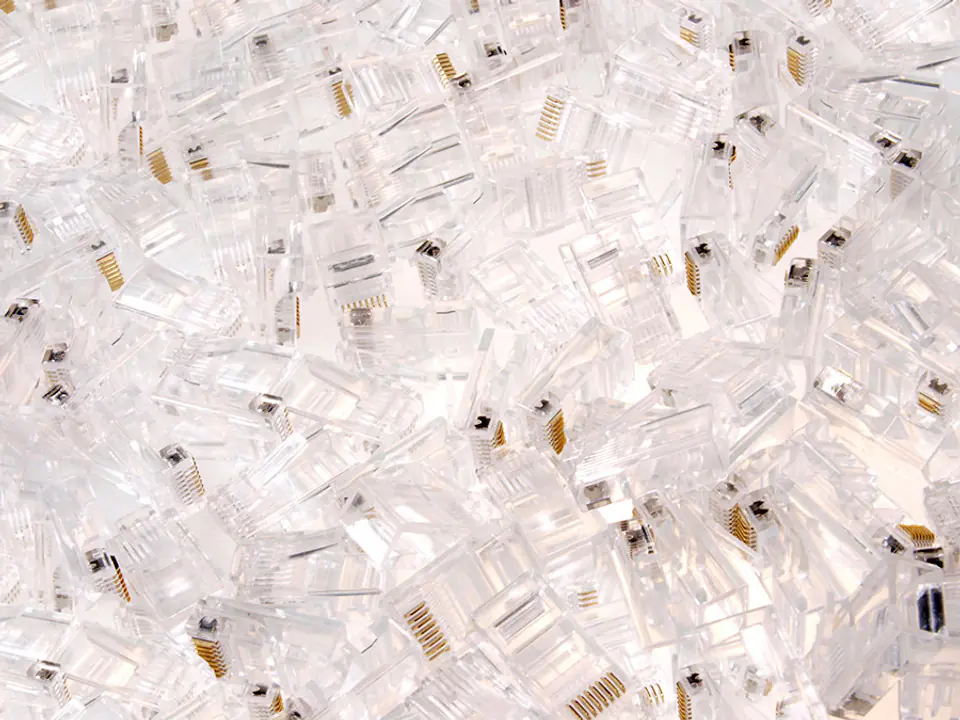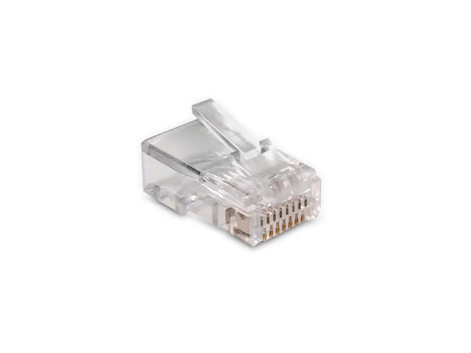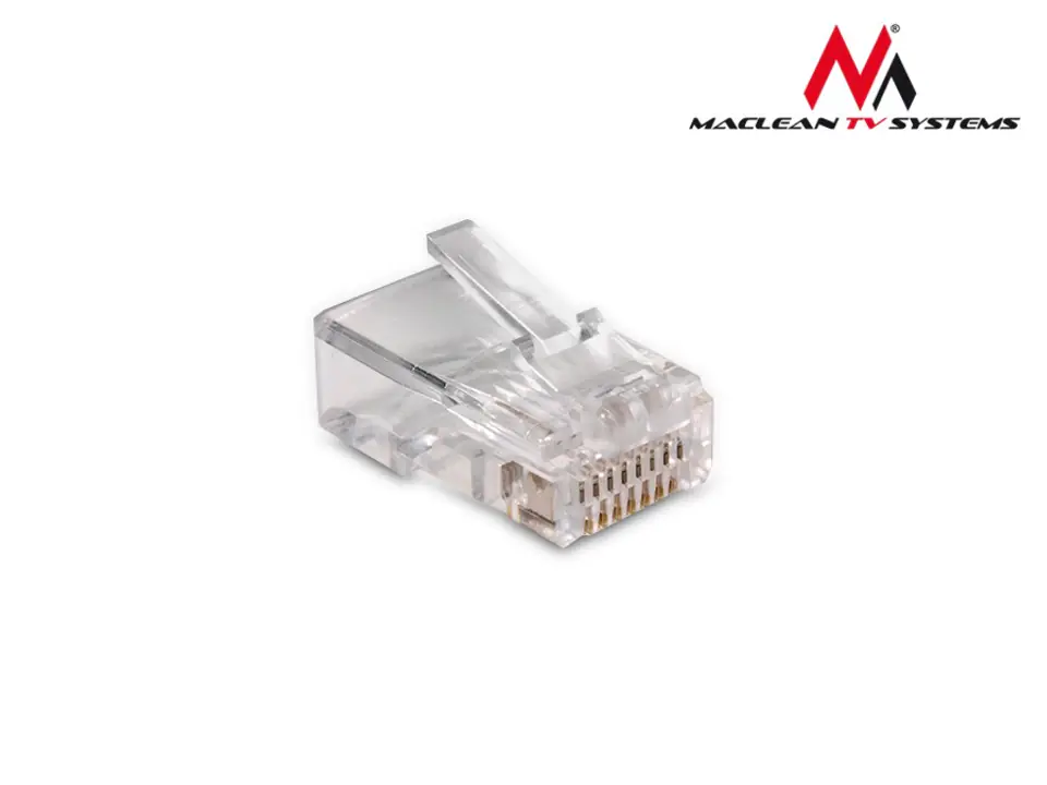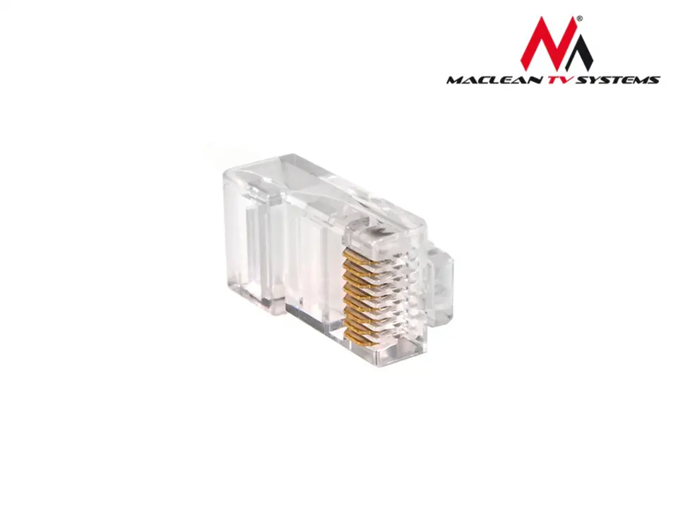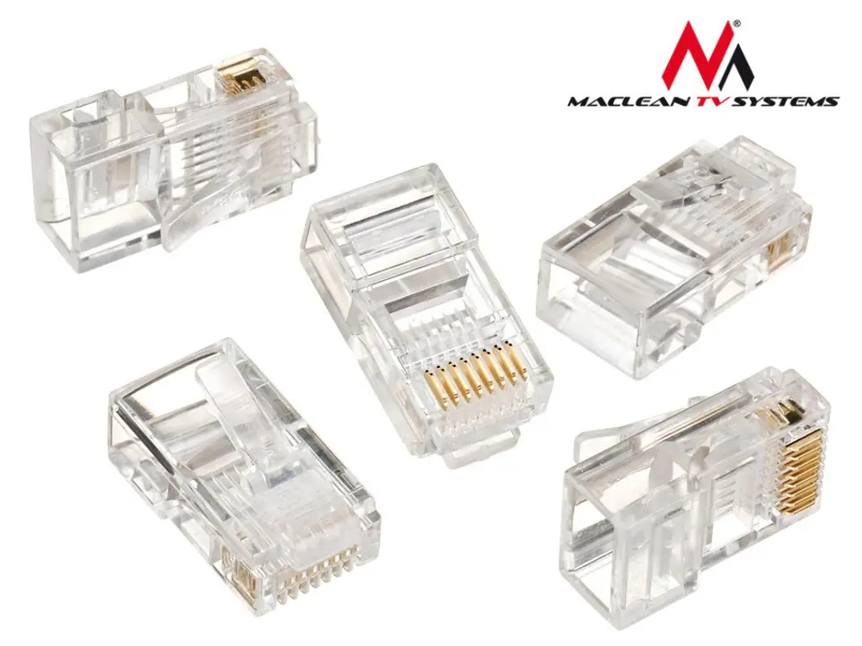 Wysokiej jakości wtyki RJ-45 firmy Maclean.Ośmiostykowe standardowe złącze używane najczęściej do zakończenia przewodów typu "skrętka"Najbardziej rozpowszechnione jako podstawowe złącze do budowy przewodowych sieci komputerowych w standardzie Ethernet .Końcówki wykonane są z plastiku przezroczystego.