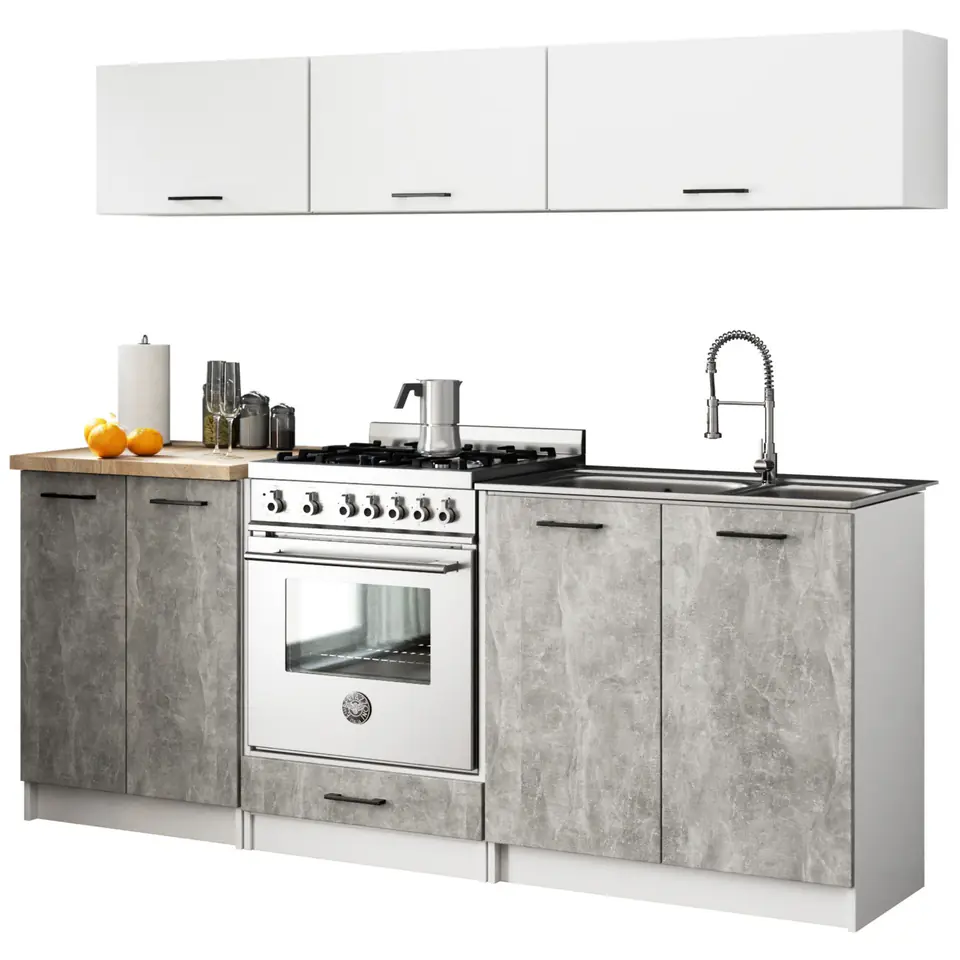 Zestaw mebli kuchennych został wykonany z płyty laminowanej o grubości 16 milimetrów. Całość wyróżnia się solidną konstrukcją, która jest gwarantem trwałości oraz odporności na uszkodzenia prezentowanego zestawu. Elementy wchodzące w jego skład można ze sobą dowolnie łączyć, personalizując w ten sposób meble, uwzględniając indywidualne potrzeby.