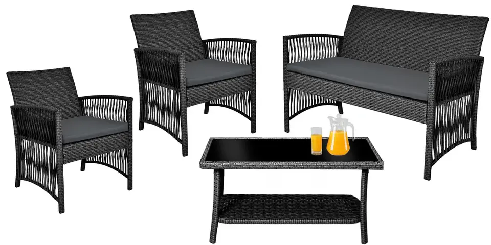 Meble ogrodowe zestaw KALINA grafitowyModel: KALINA | Kolor mebli: grafitowy Technorattan jest wyjątkowo odporny na działanie promieni UV, nie odbarwia się pod ich wpływem dzięki zawartym w sobie utrwalaczom. Meble ogrodowe z technorattanu nie wymagają konserwacji ani impregnacji. Nie straszne mu są wiatr, deszcz, śnieg czy nawet mróz. Meble są bardzo komfortowe w użyciu. Solidna konstrukcja stalowa zabezpieczona przed rdzewieniem gwarantuje stabilność i trwałość przez wiele sezonów! ✔️Zalety✅Stabilna konstrukcja stalowa pokryta technorattanem✅Wyjątkowy komfort użytkowania✅Elegancki i klasyczny zestaw mebli✅Wysoka odporność na warunki atmosferyczne oraz promieniowanie UV✅Łatwość w utrzymaniu czystości i pielęgnacji (Brak potrzeby konserwacji i impregnacji)✅Wygodne poduszki o grubości 5cm z zdejmowaną powłoczką✅Funkcjonalny stolik ze szklanym blatem ze szkła hartowanego Wymiary produktuWymiary fotela:Wysokość: 76,5 cmSzerokość: 58 cmWysokość do podłokietników: 61 cmGłębokość siedziska: 46 cmSzerokość siedziska: 51 cmWysokość podłokietników od siedziska: 21 cmWysokość oparcia: 39 cmWymiary stolika:Wysokość: 39 cmWymiar blatu: 41 x 76 cmGrubość obrzeża blatu: 3 cmWymiar szyby: 71 x 36 cm, grubość 4 mmWymiary sofy:Wysokość: 78,5 cmSzerokość: 106 cmWysokość do podłokietników: 60 cmWysokość od siedziska do podłokietników: 21 cmWysokość oparcia: 40 cmSzerokość oparcia: 101 cm Informacje dodatkowePrzedstawione kolory należy traktować poglądowo - mogą odbiegać od rzeczywistych ze względu na różne ustawienia monitorów oraz proces obróbki zdjęć. Rzeczywiste wymiary mogą się różnić od podanych wyżej. Tolerancja błędów może wynosić +/- 5%. Marka:eHokeryKod produktu:060003MGKod EAN:5905523060003Kolor mebli:grafitowyMateriał:technorattanMateriał konstrukcji:stalPrzeznaczenie:ogród | taras | balkonDo samodzielnego montażu:tak