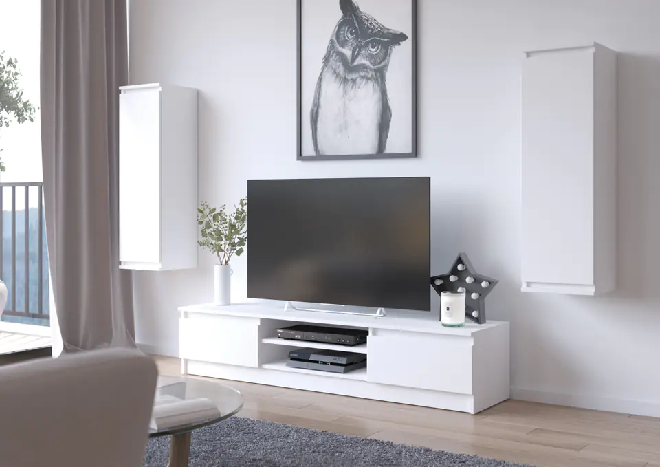 Szafka RTV i szafki wiszące w kolorze białym znakomicie skomponują się z nowoczesnym wystrojem wnętrza. Odcień klasycznej bieli jest przy tym na tyle uniwersalny, że zestaw mebli będzie się efektownie prezentował zarówno w pokoju, w którym dominuje pastelowa kolorystyka, jak i w salonie ze ścianami czy dywanem w ciemniejszej tonacji. Meble zostały wykonane z płyty laminowanej wykończonej obrzeżem ABS, która jest odporna na ścieranie, zarysowania i długotrwałe użytkowanie.