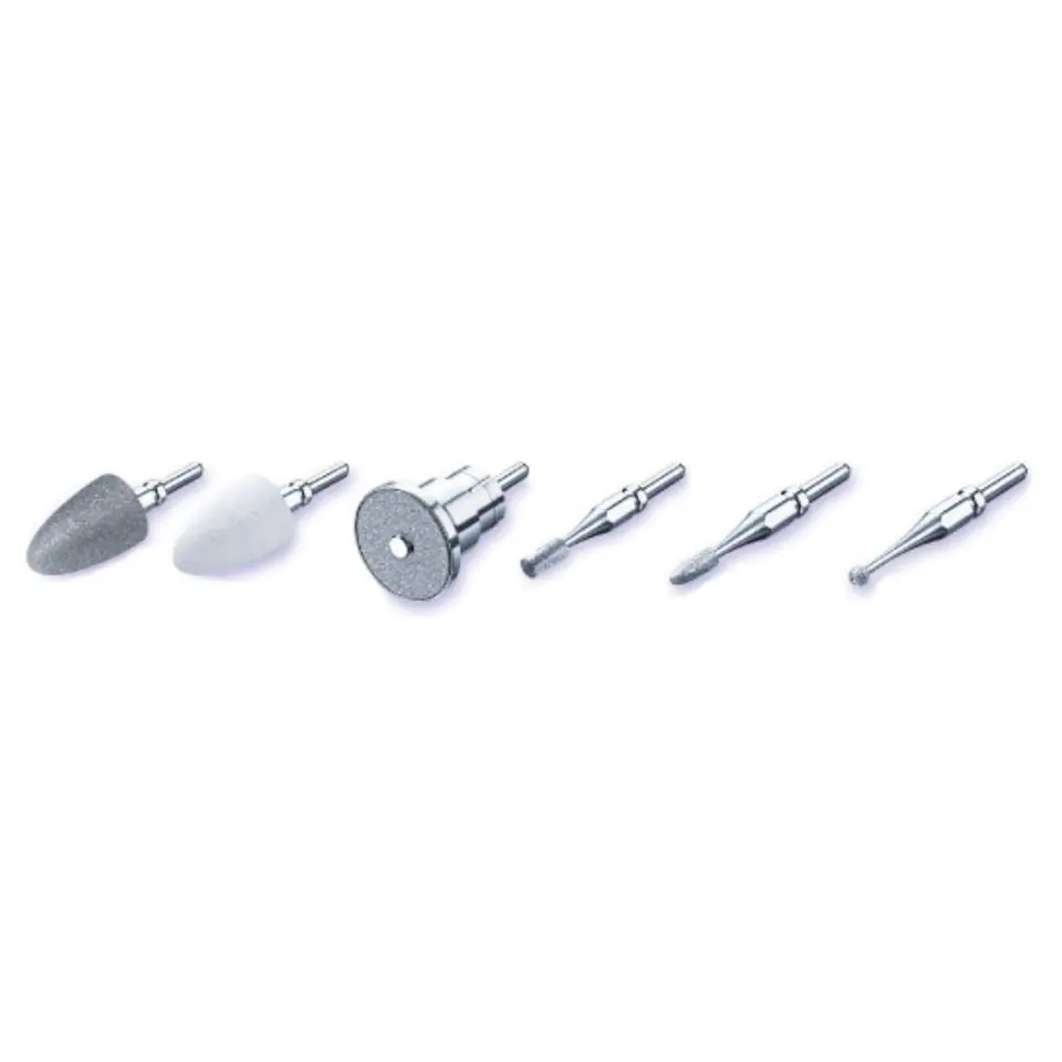 6 końcówek - dla każdego etapu manicure oraz pedicure. A - Największa piłująca końcówka (szafirowy stożek) jest w kształcie walca i służyć może do opiłowania paznokci ale również do usuwania zrogowaciałego naskórka z okolic paznokci i pięt. B- Druga filcowa końcówka w kształcie stożka to element zapewniający idealną gładkość i połysk paznokcia - polerowanie. C- Końcówka w kształcie płaskiego dysku, skonstruowana tak, by uniknąć niebezpieczeństwa ścięcia zbyt dużej powierzchni paznokcia lub uszkodzenia innej części dłoni. Wewnątrz dysku umieszczona jest część z pilnikiem i tylko i wyłącznie ona się obraca. Zewnętrzna część końcówki pozostaje na miejscu. D- Końcówka z głowicą w kształcie cylindra. Do usuwania pozostałości lakieru, twardego naskórka oraz do szlifowania. E- Końcówka z głowicą przeznaczoną do eliminowania wrastających paznokci. F- Okrągła szafirowa mała głowica, do usuwania delikatnych skórek przy paznokciu.