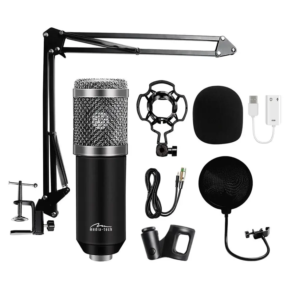 Mikrofon z zestawem akcesoriów MT397SMikrofon pojemnościowy z zestawem akcesoriów do streamingu i nagrań studyjnych. Montaż oraz użytkowanie zestawu jest banalnie proste i nie wymaga specjalistycznej wiedzy.Zestaw do nagrań audio z mikrofonem pojemnościowymStudio&Streaming Microphone MT397 to kompletny, profesjonalny zestaw do nagrań audio z mikrofonem pojemnościowym dla początkujących użytkowników jak i tych średnio zaawansowanych. Montaż oraz użytkowanie zestawu jest banalnie proste i nie wymaga specjalistycznej wiedzy. W zestawie znajdują się wszystkie niezbędne elementy: mikrofon pojemnościowy, regulowany statyw biurkowy, pop-filtr, kosz antywibracyjny, gąbkowa owiewka, zewnętrzna karta dźwiękowa oraz okablowanie.Studio&Streaming Microphone to idealny zestaw dla: