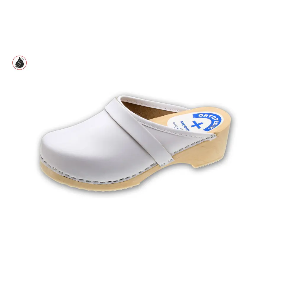Pantolety zdrowotne (drewniaki) Na spodach drewnianych z profilem ortopedycznym, podeszwą przeciwpoślizgową i cholewką skórzaną.