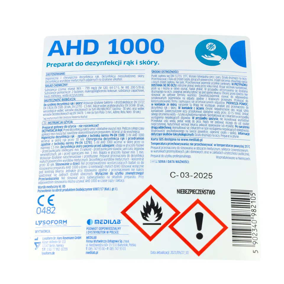 Alkoholowy płyn do dezynfekcji rąk. przeznaczony do dezynfekcji rąk przed zabiegami przebiegającymi z naruszeniem ciągłości tkanek posiada szerokie spektrum biobójcze wobec bakterii, prątków, grzybów i wirusów – inaktywacja wirusa Polio w 1 minutę wykazuje natychmiastowe i przedłużone działanie dezynfekujące oparty na bazie alkoholu etylowego dodatek substancji nawilżających chroni skórę przed utratą wody obecny olejek zapachowy neutralizuje charakterystyczny zapach alkoholu polecany do dezynfekcji skóry wrażliwej i skłonnej do alergii dobrze tolerowany przy częstym stosowaniu po użyciu nie pozostawia uczucia lepkich dłoni odtłuszcza skórę Preparat do użytku profesjonalnego. Gotowy do użycia – nie rozcieńczać. SPOSÓB UŻYCIA: Higieniczna dezynfekcja rąk – zgodnie z techniką normy EN 1500: Płyn należy aplikować na suche, czyste i zdrowe ręce.Nanieść 3 ml preparatu w zagłębienie dłoni.Wcierać w skórę rąk przez 30 sekund.Nie spłukiwać, pozostawić do wyschnięcia.Chirurgiczna dezynfekcja rąk i przedramion zgodnie z techniką normy EN 12791: Płyn należy aplikować na suche, czyste i zdrowe ręce.Nanieść 5 ml preparatu w zagłębienie dłoni.Wcierać w skórę rąk i przedramion przez co najmniej 1,5 minuty.Nie spłukiwać, pozostawić do wyschnięcia.Dezynfekcja skóry ubogiej w gruczoły łojowe przed zabiegami: Skórę zwilżyć preparatem używając bezpośrednio atomizera lub przy pomocy jałowego, nasączonego gazika.Odczekać wymagany czas: przed punkcjami i iniekcjami – co najmniej 15 s; przed punkcjami stawów, jam ciała, organów wewnętrznych i operacjami – co najmniej 1 min.Nie wycierać, pozostawić do wyschnięcia.Dezynfekcja skóry bogatej w gruczoły łojowe przed zabiegami: Skórę zwilżyć preparatem używając bezpośrednio atomizera lub przy pomocy jałowego, nasączonego gazika.Odczekać wymagany czas – co najmniej 1 min.Nie wycierać, pozostawić do wyschnięcia. SKŁAD CHEMICZNY etanol - 79,9% (799 mg/g ), substancje nawilżające, zapachowe, woda SKUTECZNOŚĆ BIOBÓJCZA Preparat wykazuje potwierdzone badaniami działanie: bakteriobójcze, prątkobójcze, grzybobójcze - 30 sek. oraz wirusobójcze (Polio - 1 min., Adeno, Noro - 30 sek.). Dodatkowe działanie wobec wirusów: HIV, HBV, HCV (BVDV), SARS-CoV-2 (Vaccinia), HSV, A H1N1, Rota - 30 sek. OPAKOWANIA AHD 1000: butelka - 250 ml z atomizerem AHD 1000: butelka - 500 ml AHD 1000: worek - 700 ml AHD 1000: butelka - 1 L AHD 1000: kanister - 5 L Produktów biobójczych należy używać z zachowaniem środków ostrożności. Przed każdym użyciem należy przeczytać etykietę i informacje dotyczące produktu. Numer pozwolenia na obrót produktem biobójczym: 6987/17