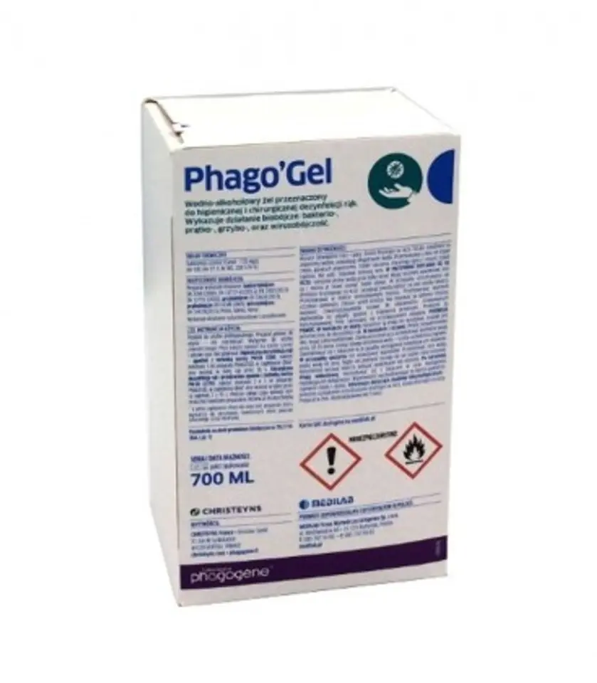Medilab STERISOL PHAGO GEL 700ml Wodno-Alkoholowy żel do higienicznej i chirurgicznej dezynfekcji rąkPhago'gel to wodno-alkoholowy preparat w postaci żelu do higienicznej i chirurgicznej dezynfekcji rąk metoda wcierania.preparat na bazie etanoluczas dezynfekcji higienicznej określono wg metodyki EN 1500czas dezynfekcji chirurgicznej i działanie przedłużone określono wg metodyki EN12791nie zawiera substancji obciążających skórę – pozbawiony zapachu i barwnikówdodatek glicerolu oraz emolientu chroni skórę przed wysuszeniemdedykowany do skóry alergicznej i bardzo wrażliwejhipoalergiczny preparat dezynfekujący gwarantujący najwyższe standardy higieniczne i jakościowe.Spektrum działania:w 30 sekund: bakterio-; drożdżako-; grzybo-; prątko-; i wirusobójcze (Polio, Adeno i Noro)npotwierdzone badaniami,w 30 sekund: wirusobójcze (Polio, Adeno, Noro)Dodatkowe działanie wobec wirusów: BVDV (HCV), VACCINIA, Rota, h2N1, H5N1, HIV, HBV, Corona - 15 sekundProduktów biobójczych należy używać z zachowaniem środków ostrożności. Przed każdym użyciem należy przeczytać etykietę i informacje dotyczące produktu.Numer pozwolenia: 7917/19 (kat. I, gr. 1)