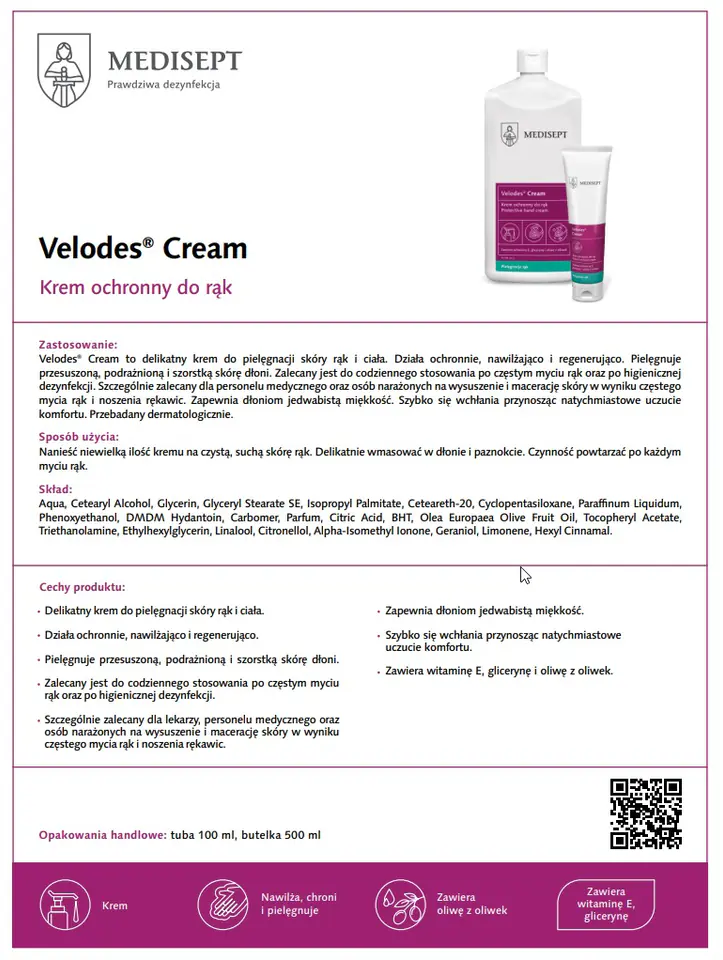 MEDISEPT Velodes Cream 500ml Delikatny krem do pielęgnacji skóry rąk i ciałaKorzyści dla użytkownika:Gwarancja skuteczności i bezpieczeństwo stosowaniaUczucie świeżości, przyjemny delikatny zapachJednoczesna ochrona i pielęgnacja dłoniZastosowanie:Velodes Cream to delikatny krem do pielęgnacji skóry rąk i ciała. działa odżywczo i regenerująco na skórę, stymuluje procesy odnowy naskórka, nawilża i łagodzi podrażnienia. Doskonale nawilża skórę, w znacznym stopniu ją uelastycznia i niweluje uczucie szorstkości. Zalecany jest do codziennego stosowani po częstym myciu rąk oraz po higienicznej dezynfekcji. Szczególnie zalecany dla lekarzy, personelu medycznego oraz osób narażonych na wysuszenie i macerację skóry w wyniku częstego mycia i noszenia rękawic. Zapewnia dłoniom jedwabista miękkość. Dodatkowo wykazuje działanie osłaniające i łagodzące podrażnienia skóry. Szybko się wchłania przynosząc natychmiastowe uczucie komfortu.Sposób użycia:Nanieść niewielką ilość kremu na czystą, suchą skórę rąk. Delikatnie wmasować w skórę dłoni i paznokci. Czynność powtarzać po każdym myciu rąk.