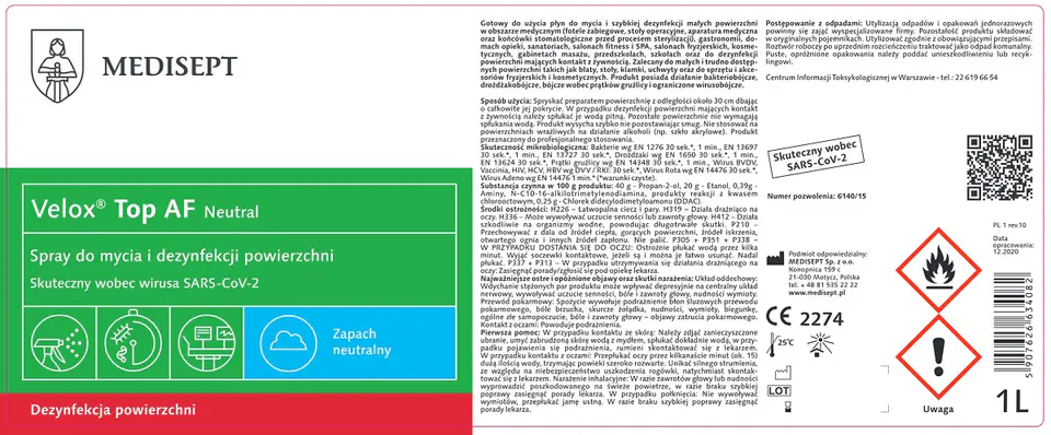 MEDISEPT Velox Top AF 1l ze spryskiwaczem - Preparat do dezynfekcji i mycia powierzchni nieinwazyjnych wyrobów medycznych Velox Top AF polecany jest do szybkiej dezynfekcji powierzchni nieinwazyjnych wyrobów medycznych i kosmetycznych takich jak: łóżka i fotele, aparatura medyczna, narzędzia kosmetyczne. Preparat nie zawiera aldehydu i fenolu dzięki czemu nie odbarwia dezynfekowanych powierzchni. Skład: propan-2-ol, alkohol etylowy, aminy, QAV Zastosowanie: Velox® Top AF to alkoholowy płyn do mycia i szybkiej dezynfekcji małych powierzchni (fotele zabiegowe, stoły operacyjne, aparatura medyczna oraz końcówki stomatologiczne przed procesem sterylizacji). Przeznaczony również do stosowania w gastronomii, domach opieki, sanatoriach, salonach fitness i SPA, salonach fryzjerskich, kosmetycznych, gabinetach masażu, przedszkolach, szkołach oraz do dezynfekcji powierzchni mających kontakt z żywnością.Nadaje się do mycia i dezynfekcji małych i trudno dostępnych powierzchni takich jak blaty, stoły, klamki, uchwyty oraz do sprzętu i akcesoriów fryzjerskich i kosmetycznych. Produkt posiada działanie bakteriobójcze, drożdżakobójcze, bójcze wobec prątków gruźlicy i ograniczone wirusobójcze. Działa na wirusy Rota i Adeno. Dezynfekcja MEDISEPT jest SKUTECZNA wobec KORONAWIRUSA Numer pozwolenia na obrót produktem biobójczym: 6140/15 Produktów biobójczych należy używać z zachowaniem środków ostrożności. Przed każdym użyciem należy przeczytać etykietę i informacje dotyczące produktu.