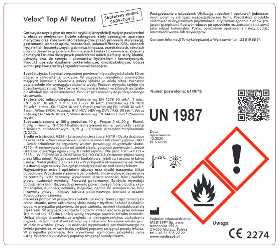 MEDISEPT Velox Top AF 5l Preparat do dezynfekcji i mycia powierzchni nieinwazyjnych wyrobów medycznychVelox Top AF polecany jest do szybkiej dezynfekcji powierzchni nieinwazyjnych wyrobów medycznych i kosmetycznych takich jak: łóżka i fotele, aparatura medyczna, narzędzia kosmetyczne. Preparat nie zawiera aldehydu i fenolu dzięki czemu nie odbarwia dezynfekowanych powierzchni.Skład:propan-2-ol, alkohol etylowy, aminy, QAVZastosowanie: Velox® Top AF to alkoholowy płyn do mycia i szybkiej dezynfekcji małych powierzchni (fotele zabiegowe, stoły operacyjne, aparatura medyczna oraz końcówki stomatologiczne przed procesem sterylizacji). Przeznaczony również do stosowania w gastronomii, domach opieki, sanatoriach, salonach fitness i SPA, salonach fryzjerskich, kosmetycznych, gabinetach masażu, przedszkolach, szkołach oraz do dezynfekcji powierzchni mających kontakt z żywnością. Idealnie nadaje się do mycia i dezynfekcji małych i trudno dostępnych powierzchni takich jak blaty, stoły, klamki, uchwyty oraz do sprzętu i akcesoriów fryzjerskich i kosmetycznych. Produkt posiada działanie bakteriobójcze, drożdżakobójcze, bójcze wobec prątków gruźlicy i ograniczone wirusobójcze. Działa na wirusy Rota i Adeno.Dezynfekcja MEDISEPT jest SKUTECZNA wobec KORONAWIRUSAProduktów biobójczych należy używać z zachowaniem środków ostrożności. Przed każdym użyciem należy przeczytać etykietę i informacje dotyczące produktu.Numer pozwolenia na obrót produktem biobójczym: 6140/15