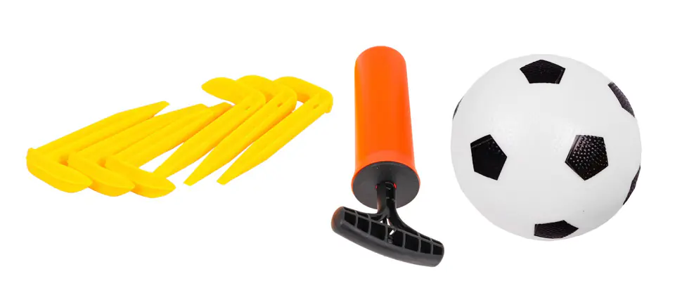 - rurki i łączniki do złożenia bramki, - siatka, - gumowa piłka, - pompka, - haki do mocowania w podłożu.