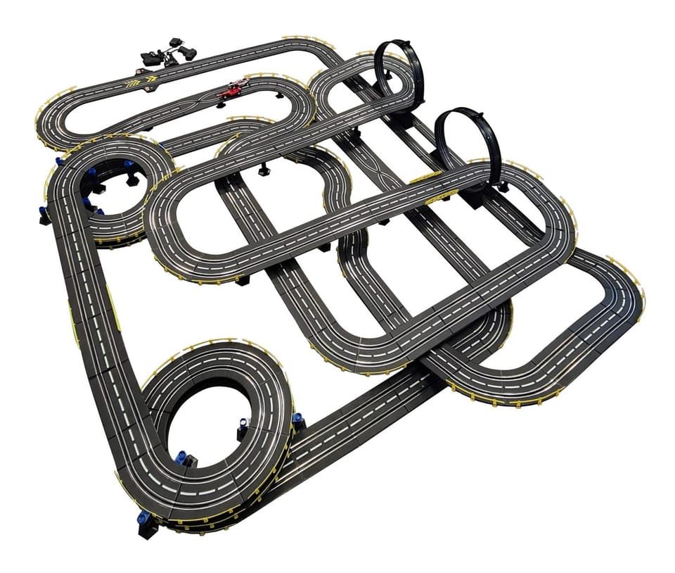 Gigantyczny tor wyścigowy z ostrymi zakrętami, pętlami i autkami zdalnie sterowanymi, wykonany w skali 1:43 to propozycja dla dzieci od 6-go roku życia. Po torze równocześnie mogą poruszać się dwa autka. Kierunek jazdy i prędkość regulowane są pilotami zdalnego sterowania. Każdy z pojazdów sterowany jest oddzielnym pilotem. Tor został wykonany z najlepszej jakości materiałów, co gwarantuje mu wytrzymałość i solidność. Na torze znajdują się odcinki proste, ostre zakręty z barierkami zabezpieczającymi przed wypadaniem pojazdu z trasy, a także dwie pętle 360 stopni. Całkowita długość toru to aż 2800 cm.