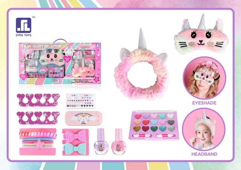 | - opaska na włosy z motywem jednorożca,- opaska na oczy z motywem jednorożca,- 2 separatory do paznokci- 2 lakiery do paznokci,- paleta 15 cieni,- 2 pędzelki dwustronne do cieni,- 4 x gumki do włosów,- sprężynka do włosów,- 2 x spinki do włosów,- pilniczek do paznokci,- naklejki na paznokcie |